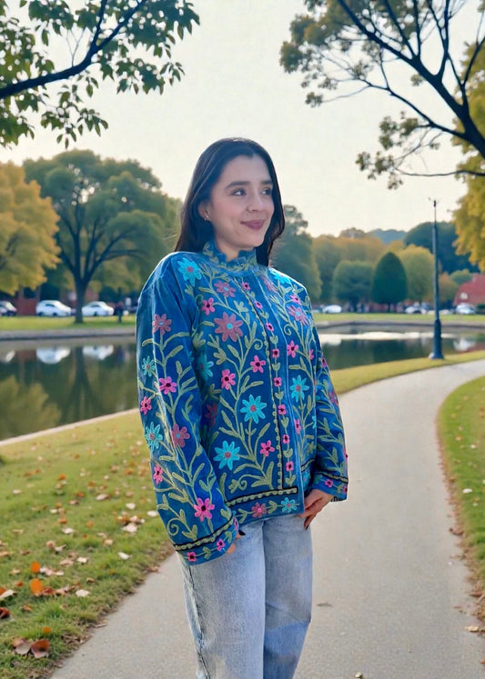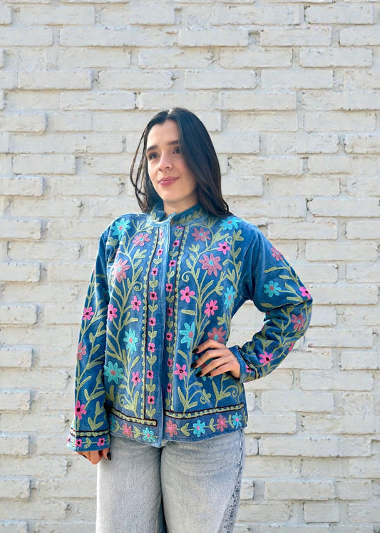 Blue And Pink Flowers Suzani Velvet Embroidered Jacket
