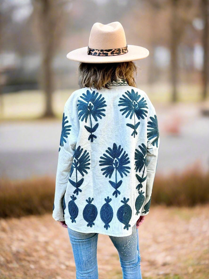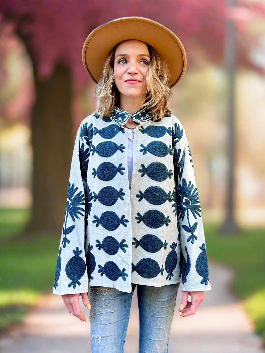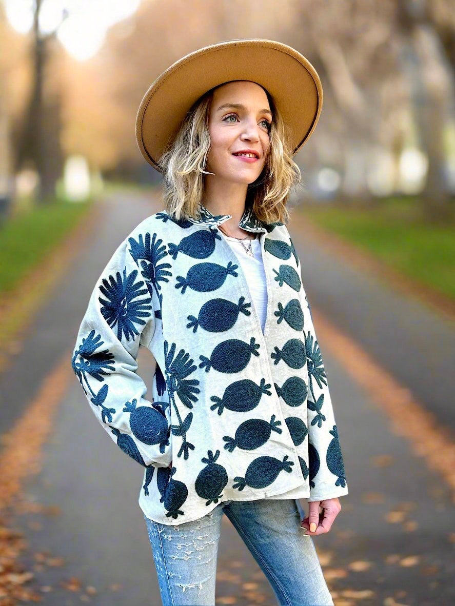 This lovely Velvet fabric is handcrafted by artisans in villages of developing countries. We love to support artisans and their beautiful crafts so they can continue making these special designs. This beautiful fabric is then designed and hand stitched into a Jacket that compliments its speciality and uniqueness.