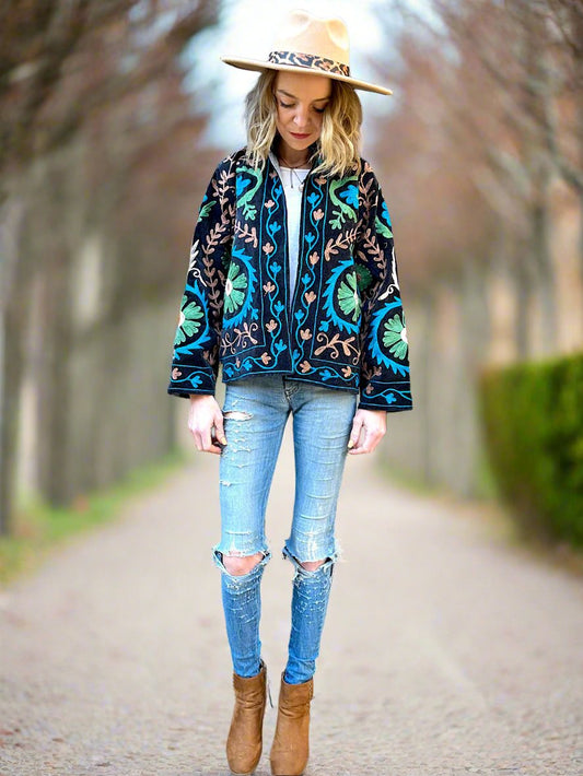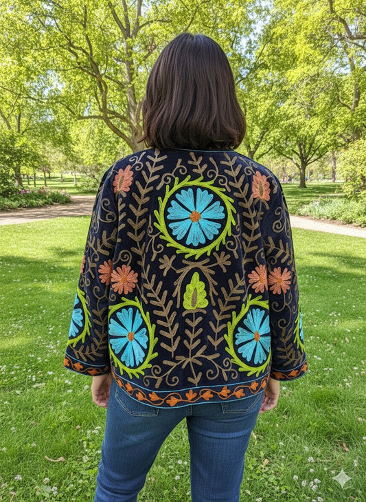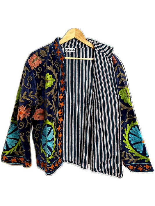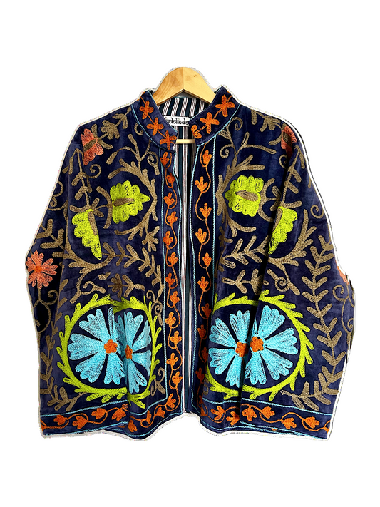 Navy Blue with Colourful Suzani Velvet Embroidered Jacket