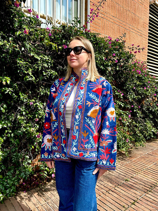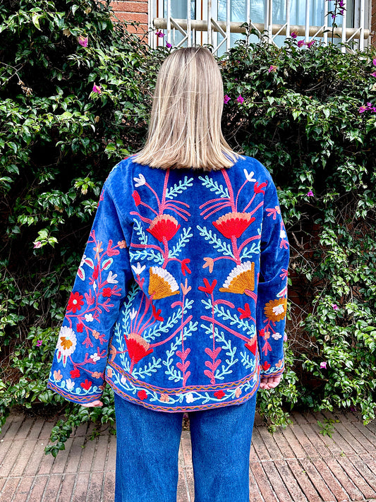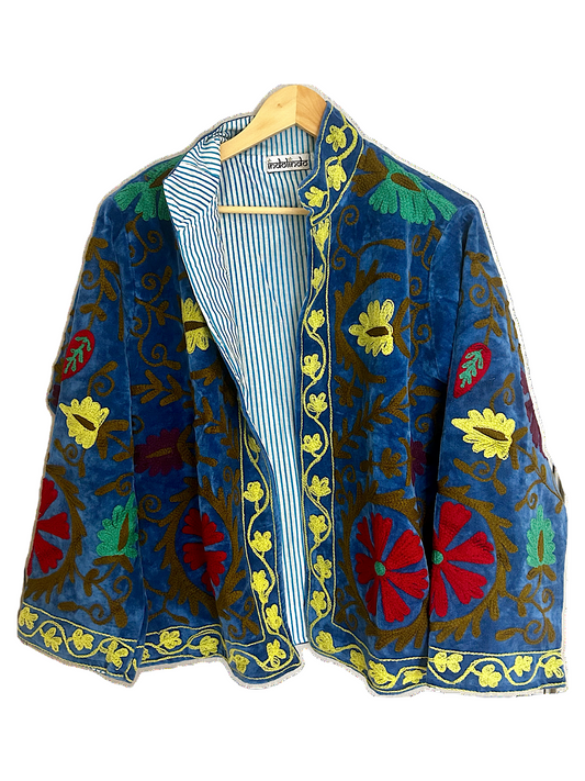 Blue with Colourful Suzani Velvet Embroidered Jacket