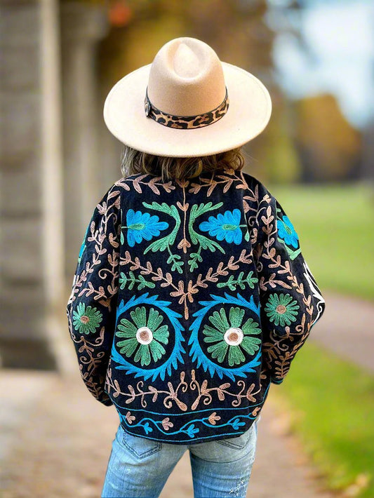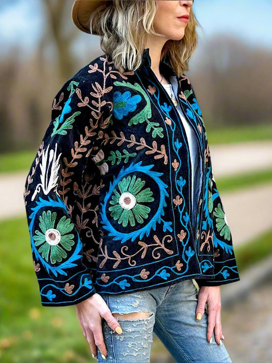 Dark Blue with Blue and Green Suzani Velvet Embroidered Jacket