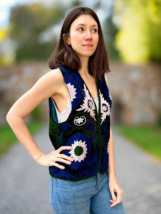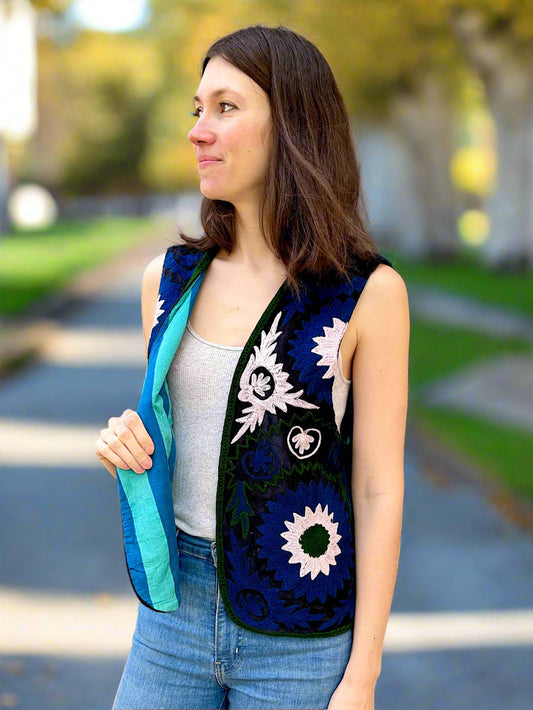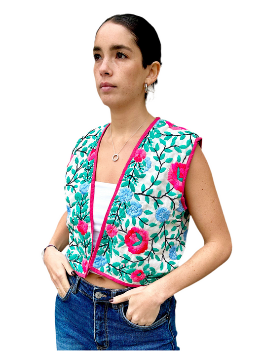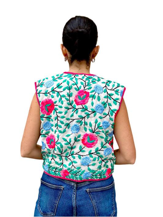 Pink and Blue Flowers Bohemian Embroidered Vest