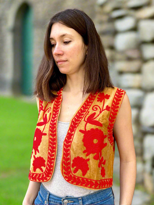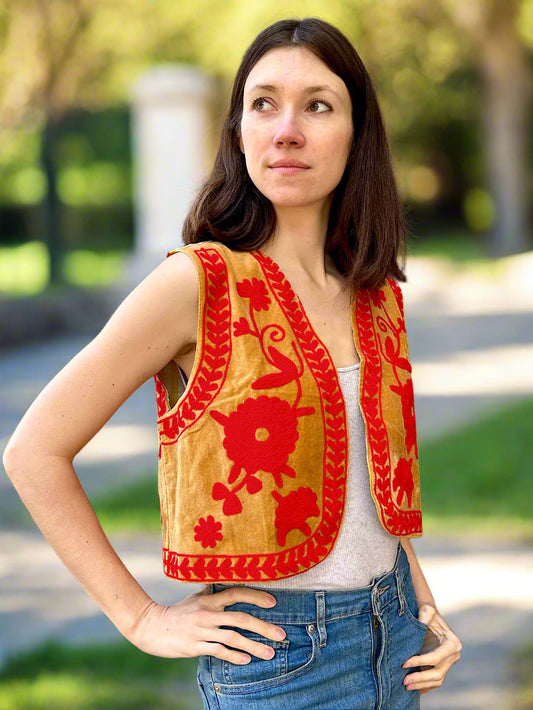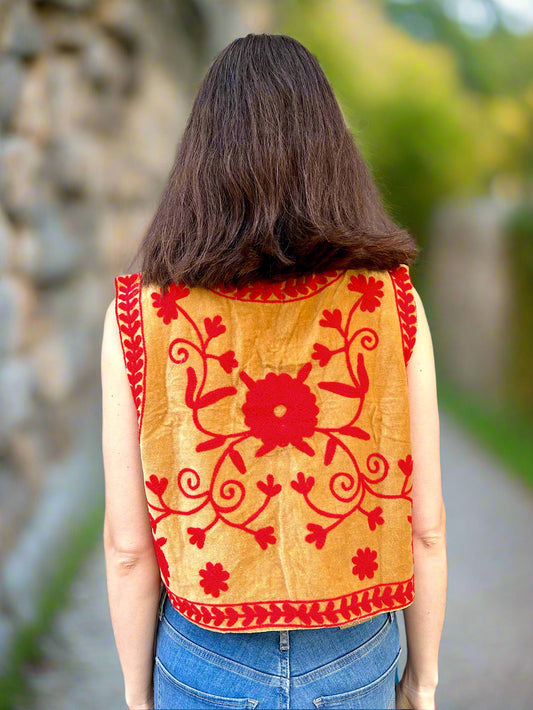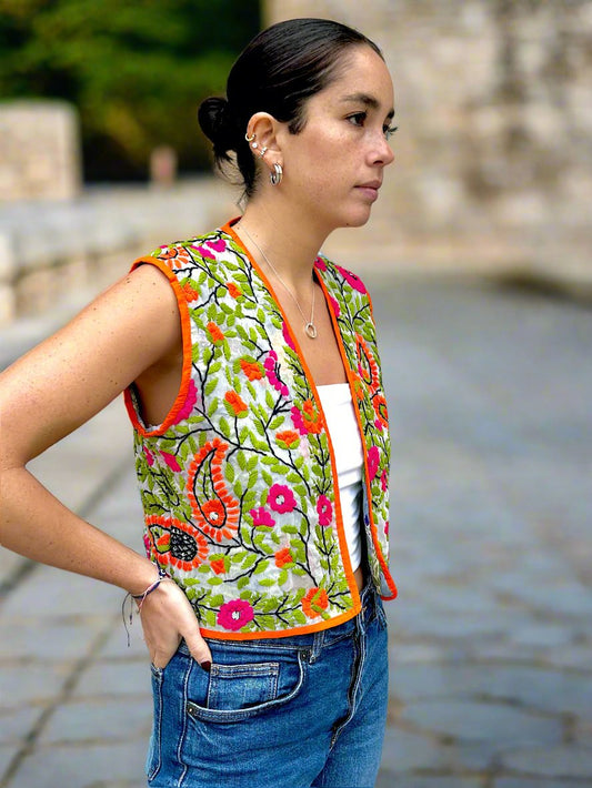 Orange And Green Crop Bohemian Embroidered Vest
