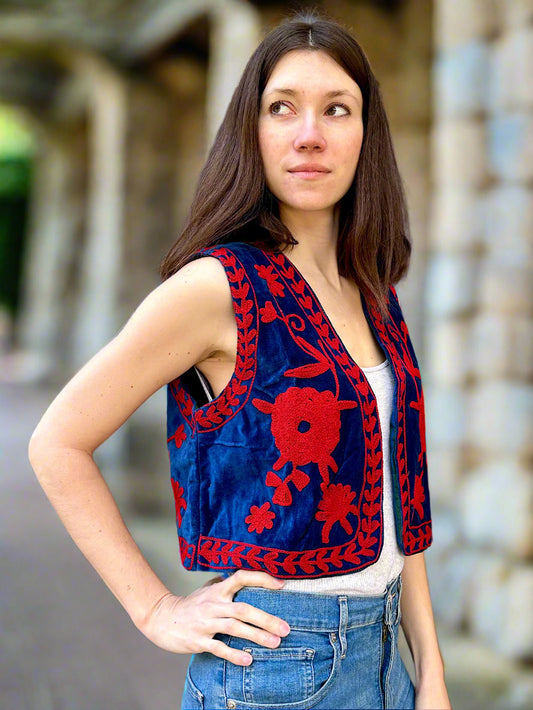 Blue and Red Velvet Embroidered Vest