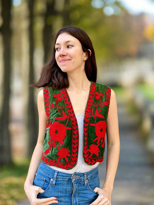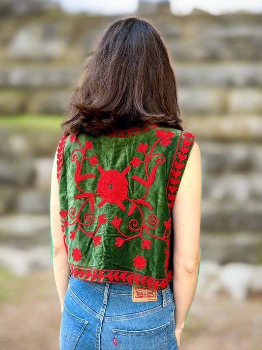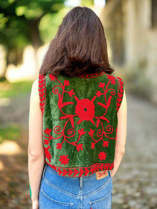 Green and Red Velvet Embroidered Vest