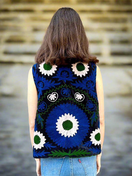 Black with Blue and White Velvet Embroidered Vest
