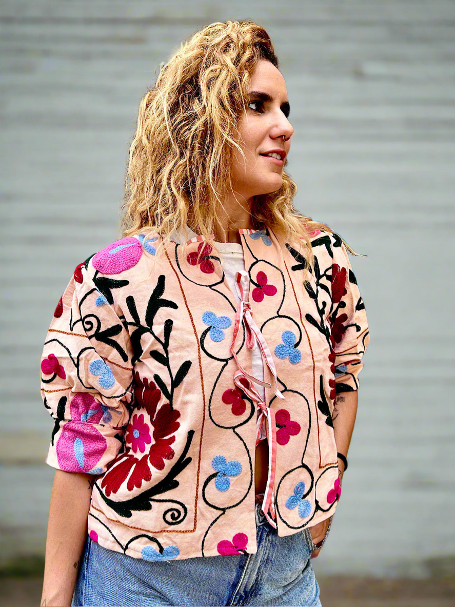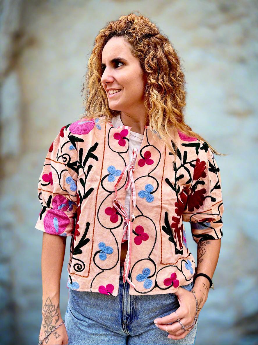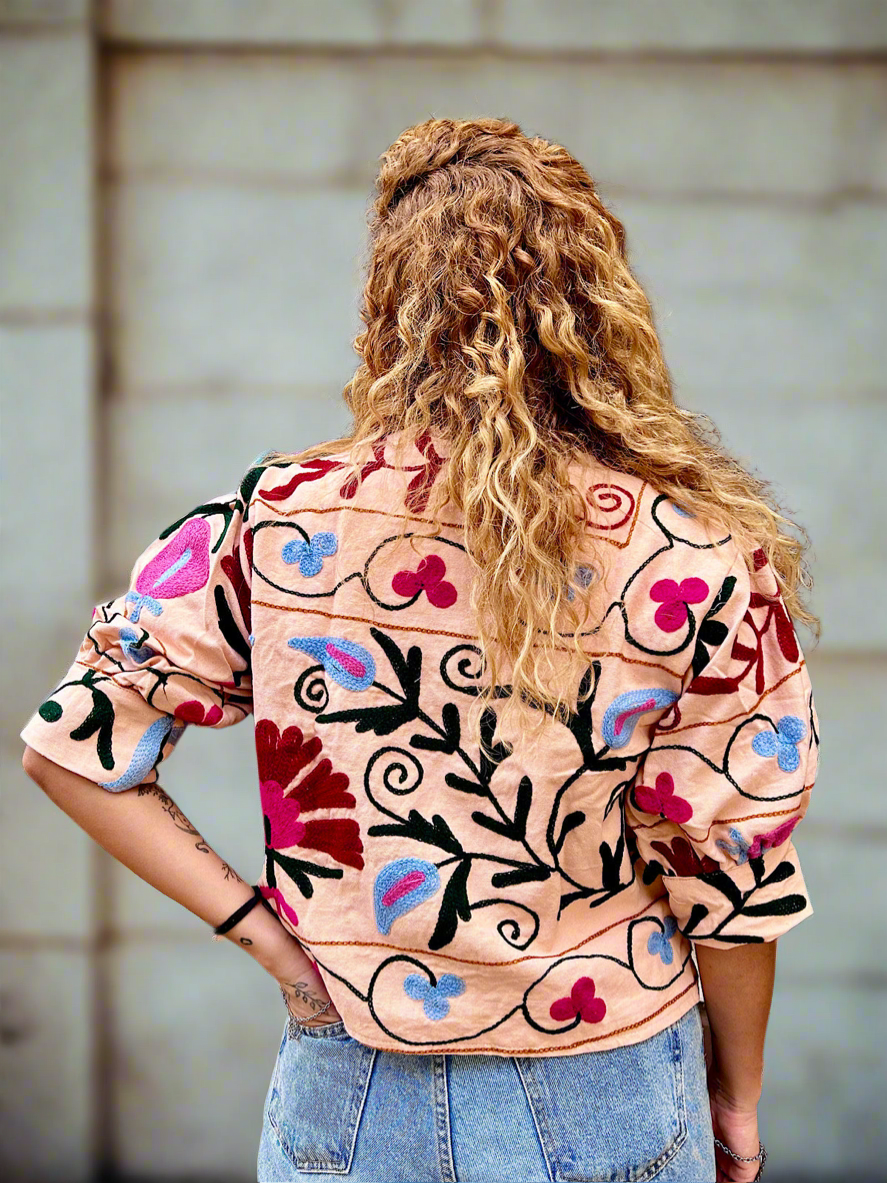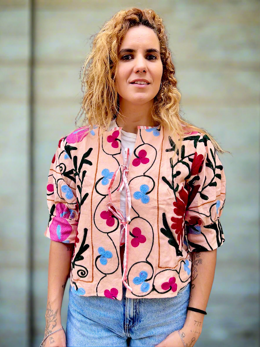 Peach Balloon Sleeve Cotton Embroidered Jacket