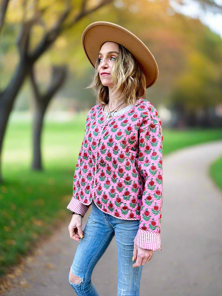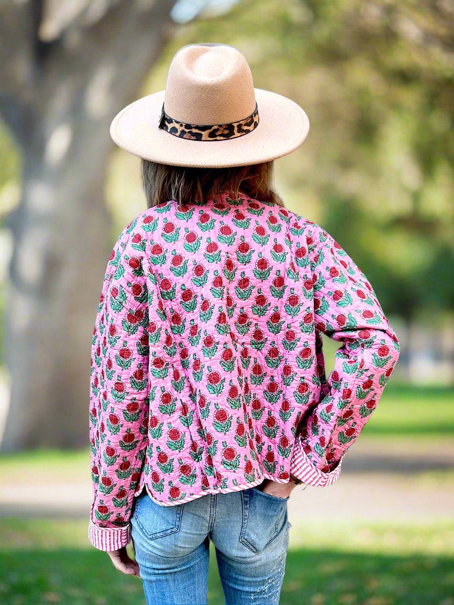 Pink Floral Motif Printed Cotton Short Reversible Jacket