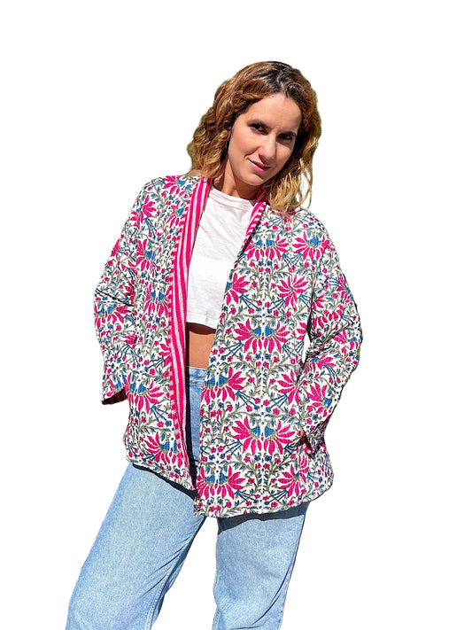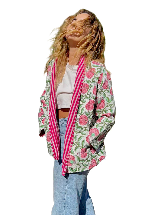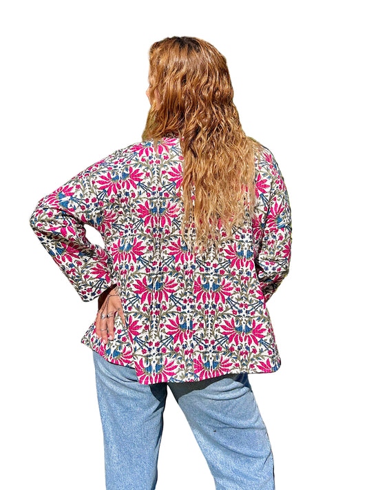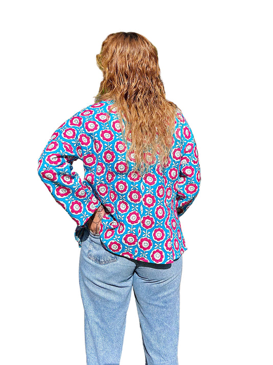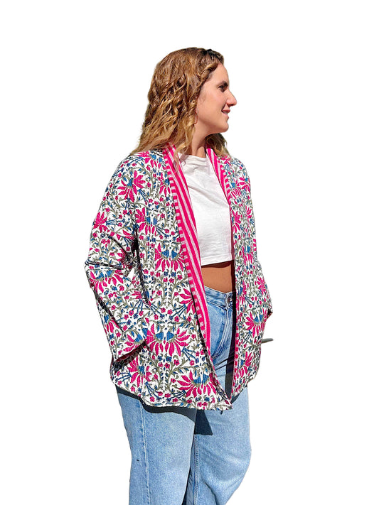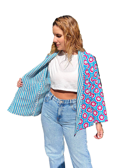 Pink and Blue Floral Block Printed Cotton Wrap Reversible Jacket