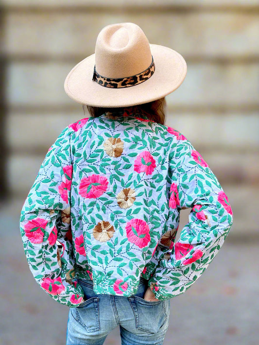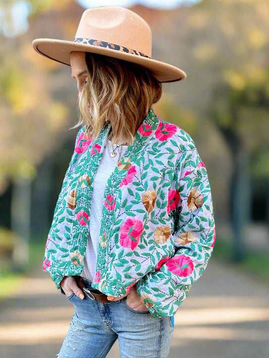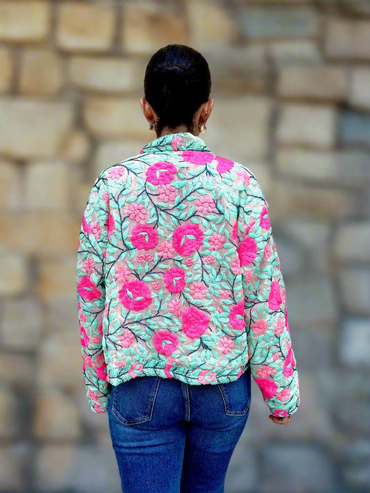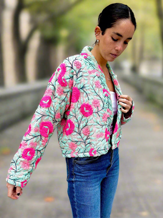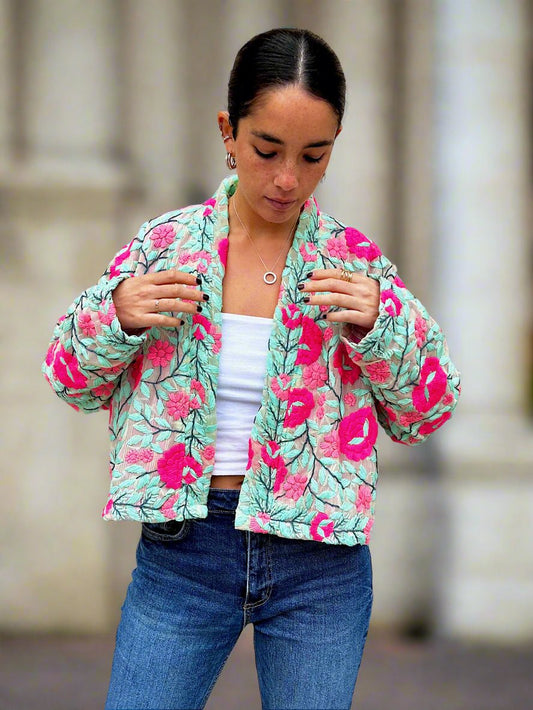 Mint Green with Pink Flowers Crop Bohemian Embroidered Jacket
