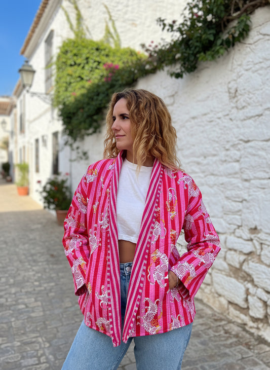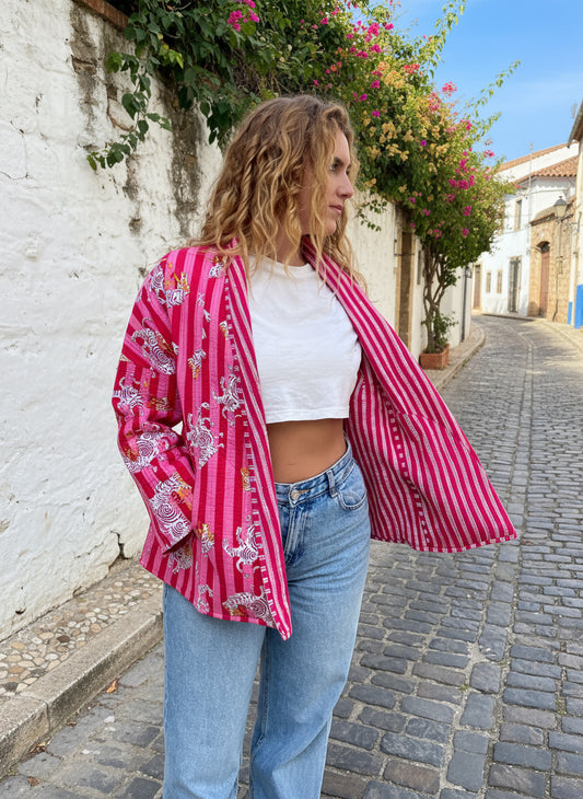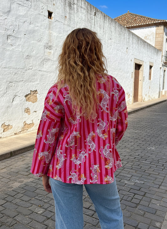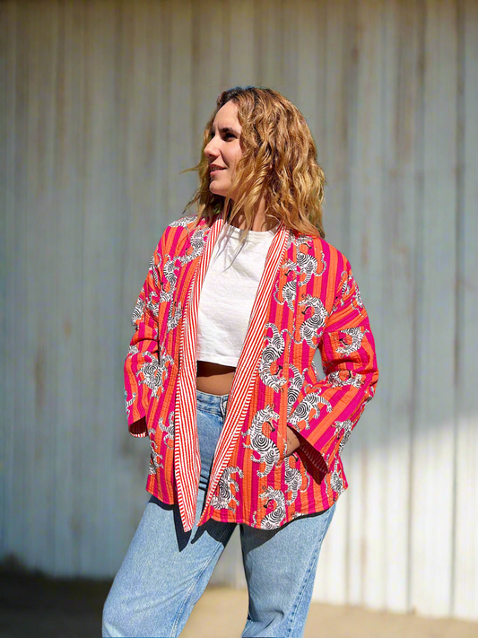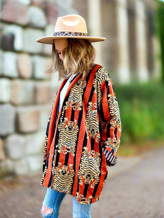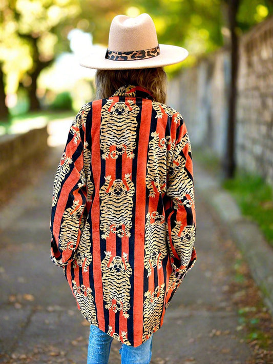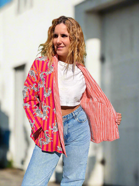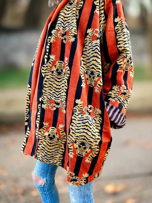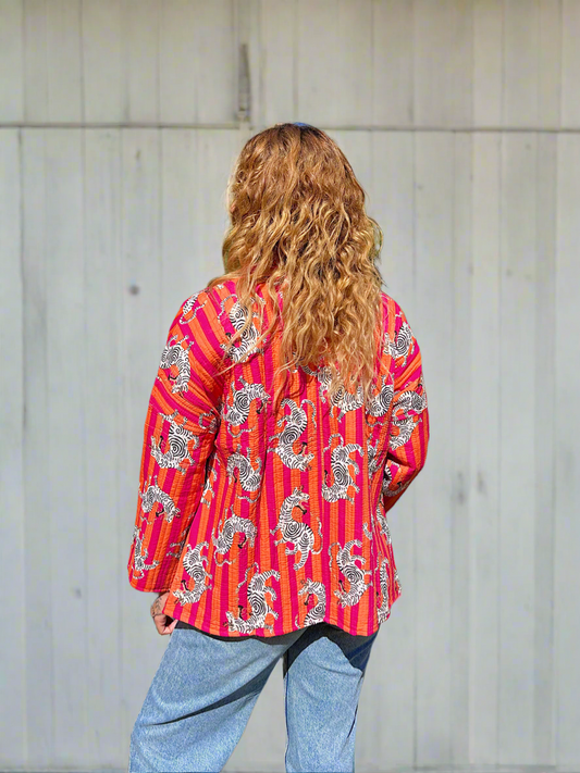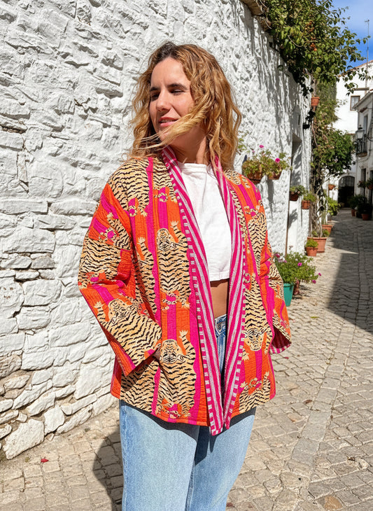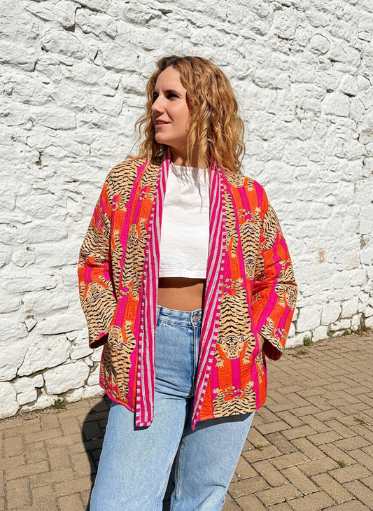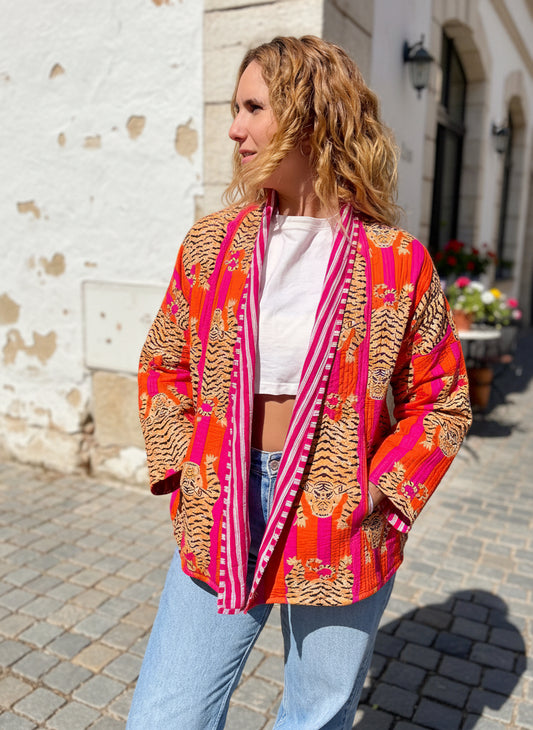 Orange and Pink Tiger Printed Cotton Wrap Reversible Jacket