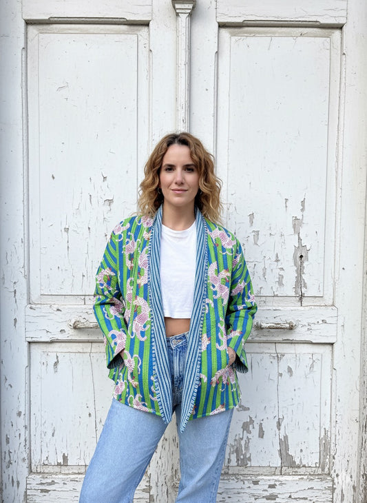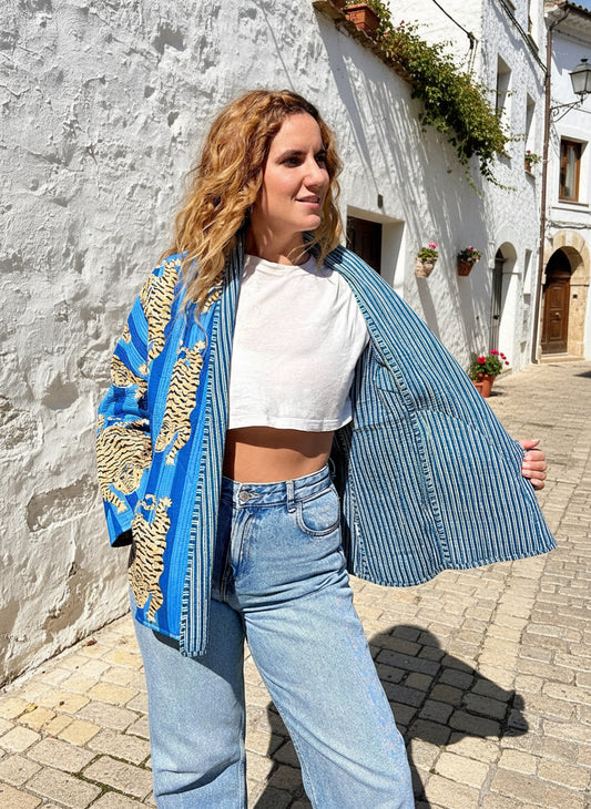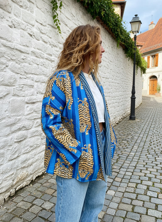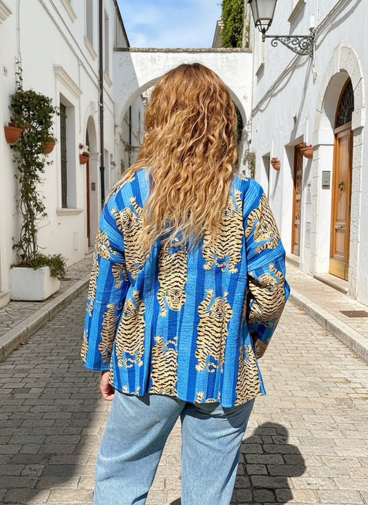 Blue Stripes Tiger Printed Cotton Wrap Reversible Jacket