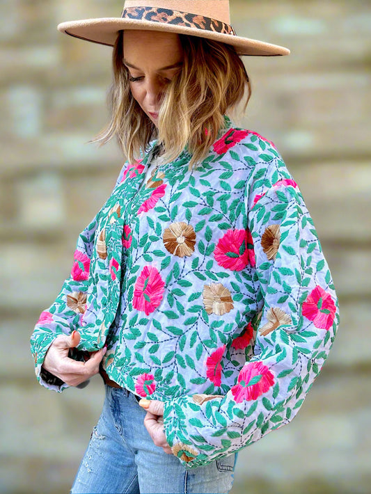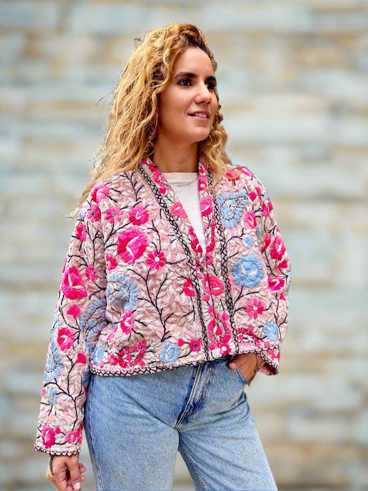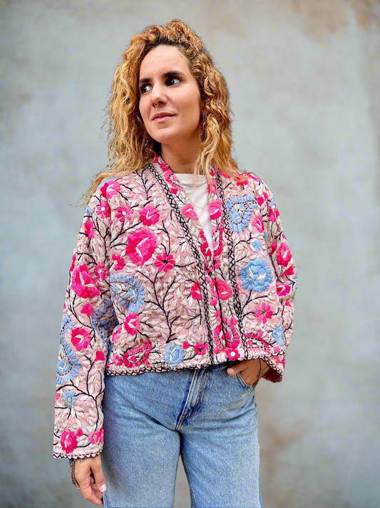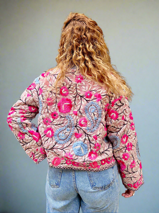 Pink Flowers and Powder Blue Paisley Crop Bohemian Embroidered Jacket