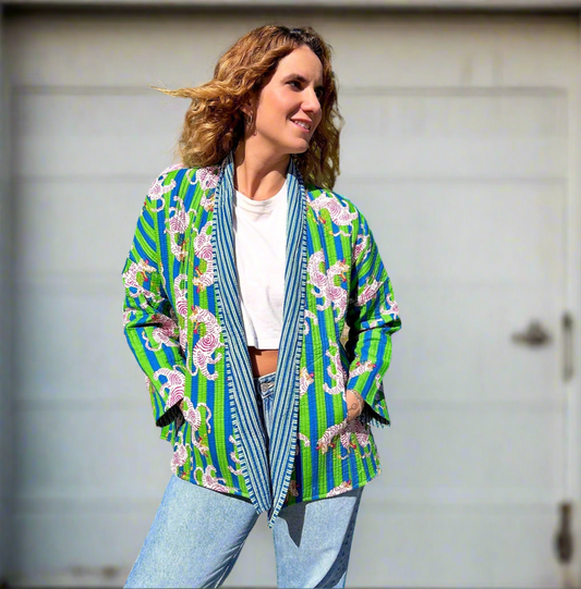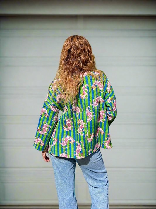 Green and Blue Stripes Dragon Printed Cotton Wrap Reversible Jacket
