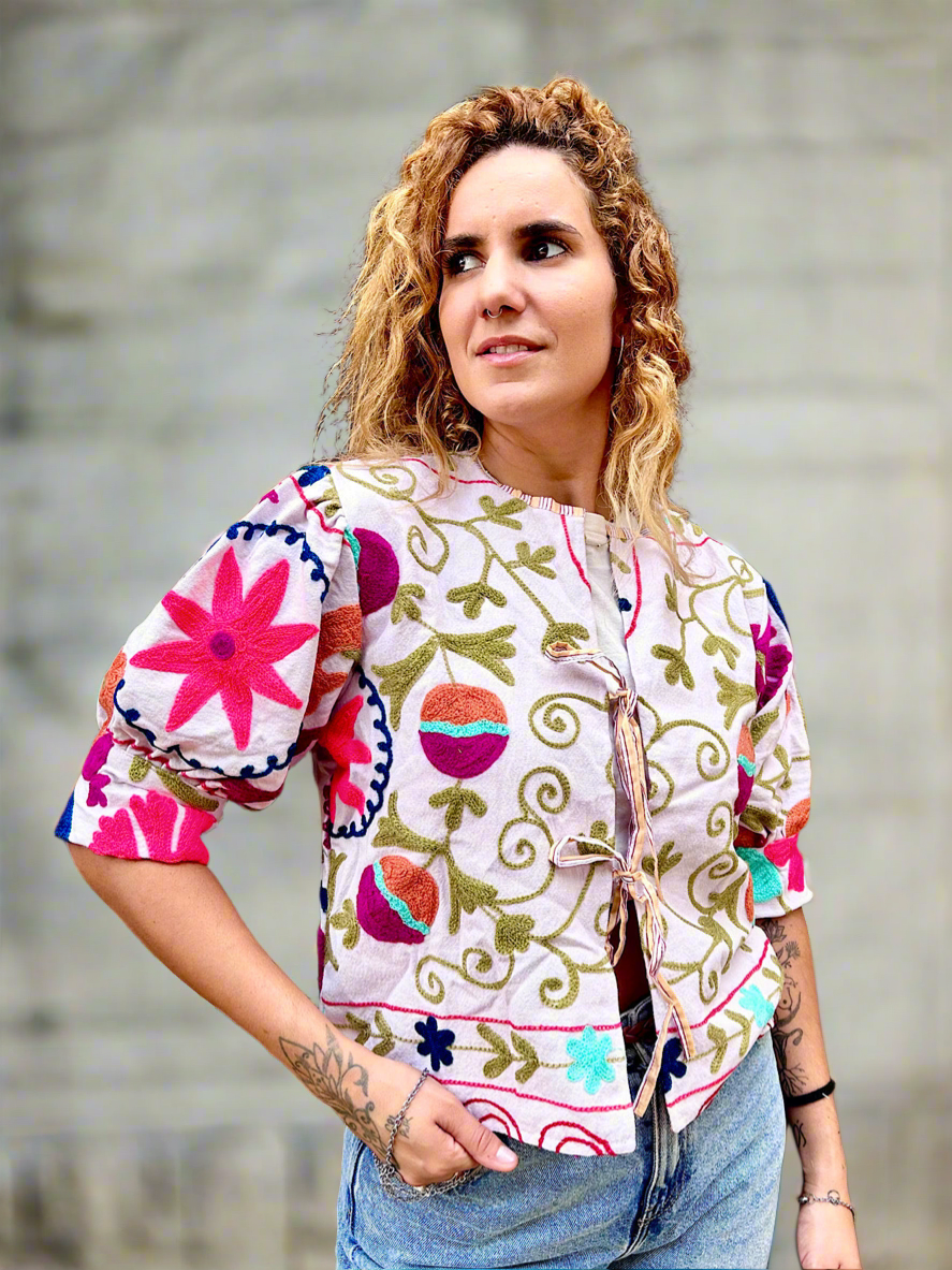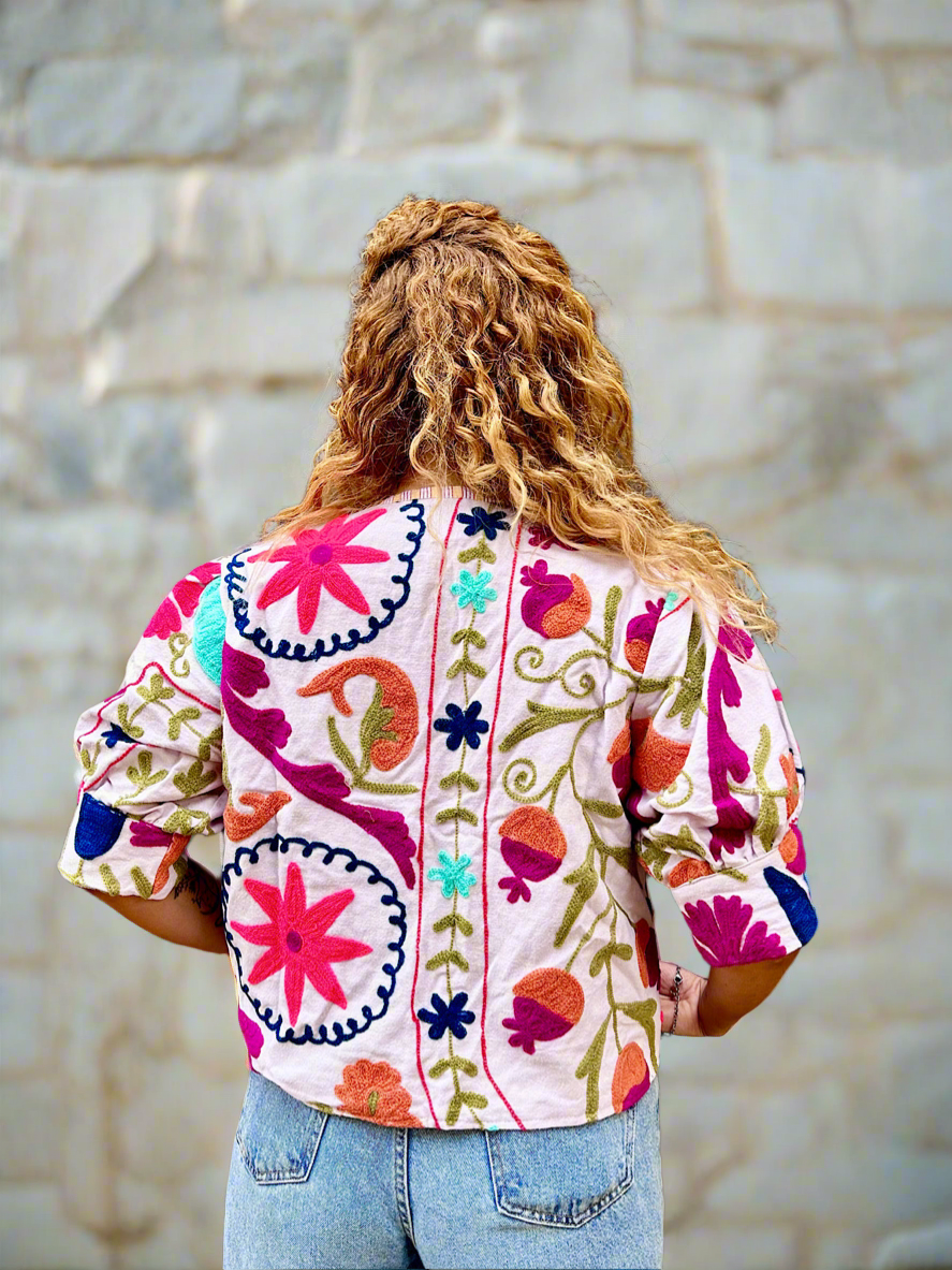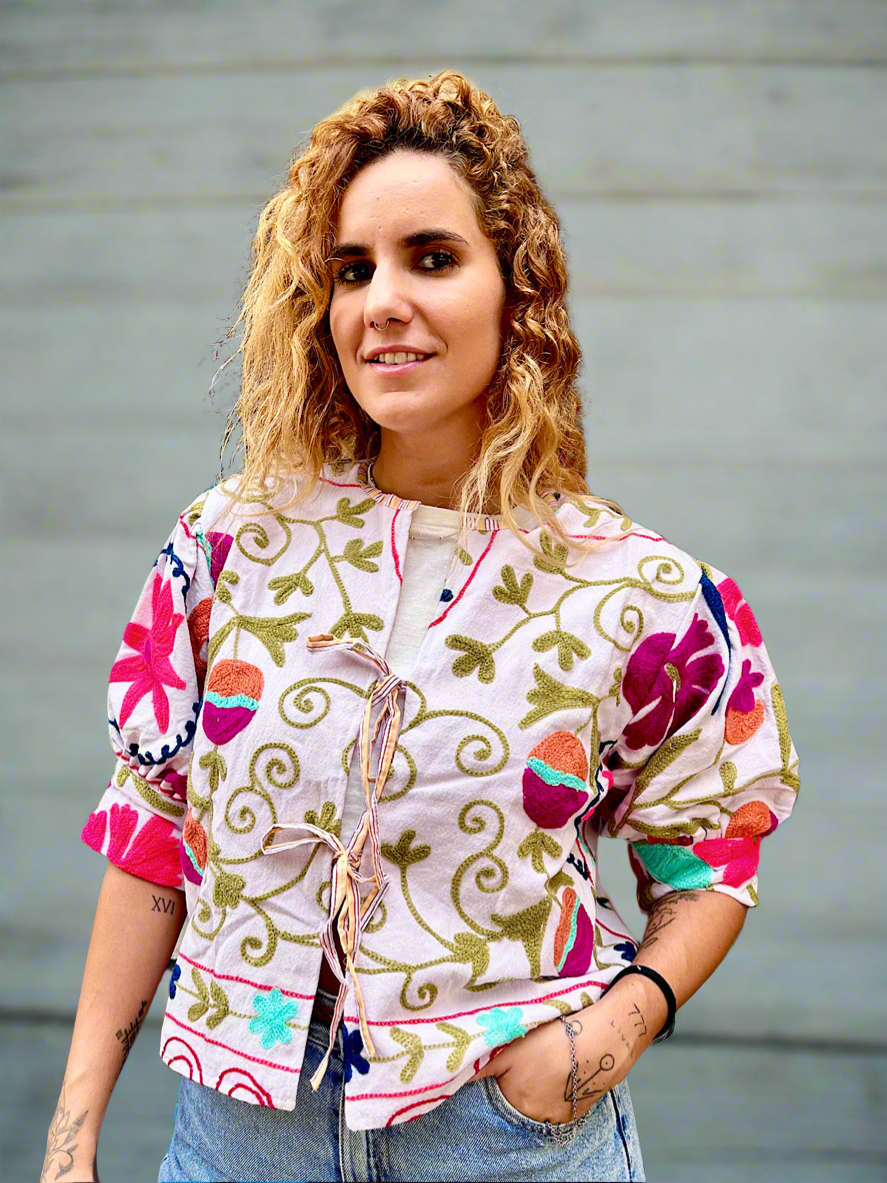 This lovely Cotton fabric is handcrafted by artisans in villages of developing countries. We love to support artisans and their beautiful crafts so they can continue making these special designs. This beautiful fabric is then designed and hand stitched into a Jacket that compliments its speciality and uniqueness.