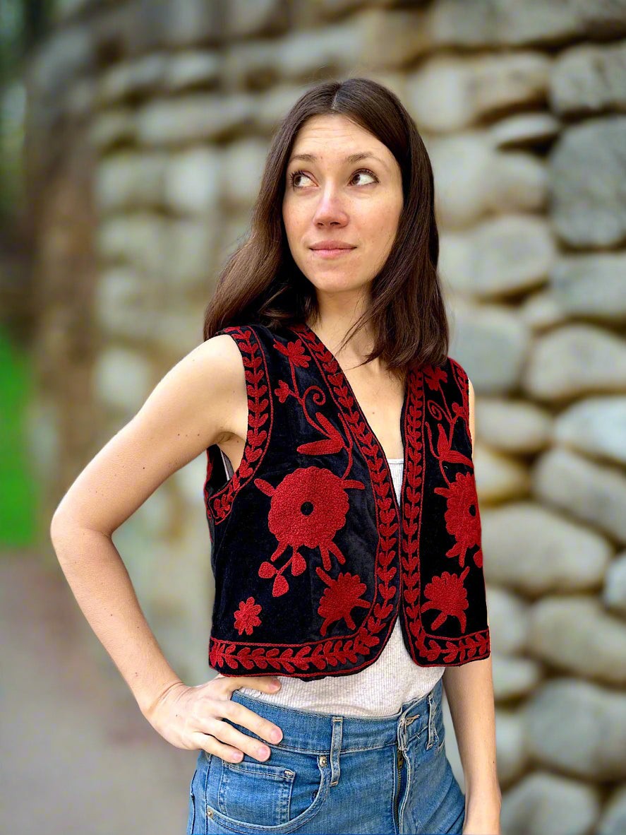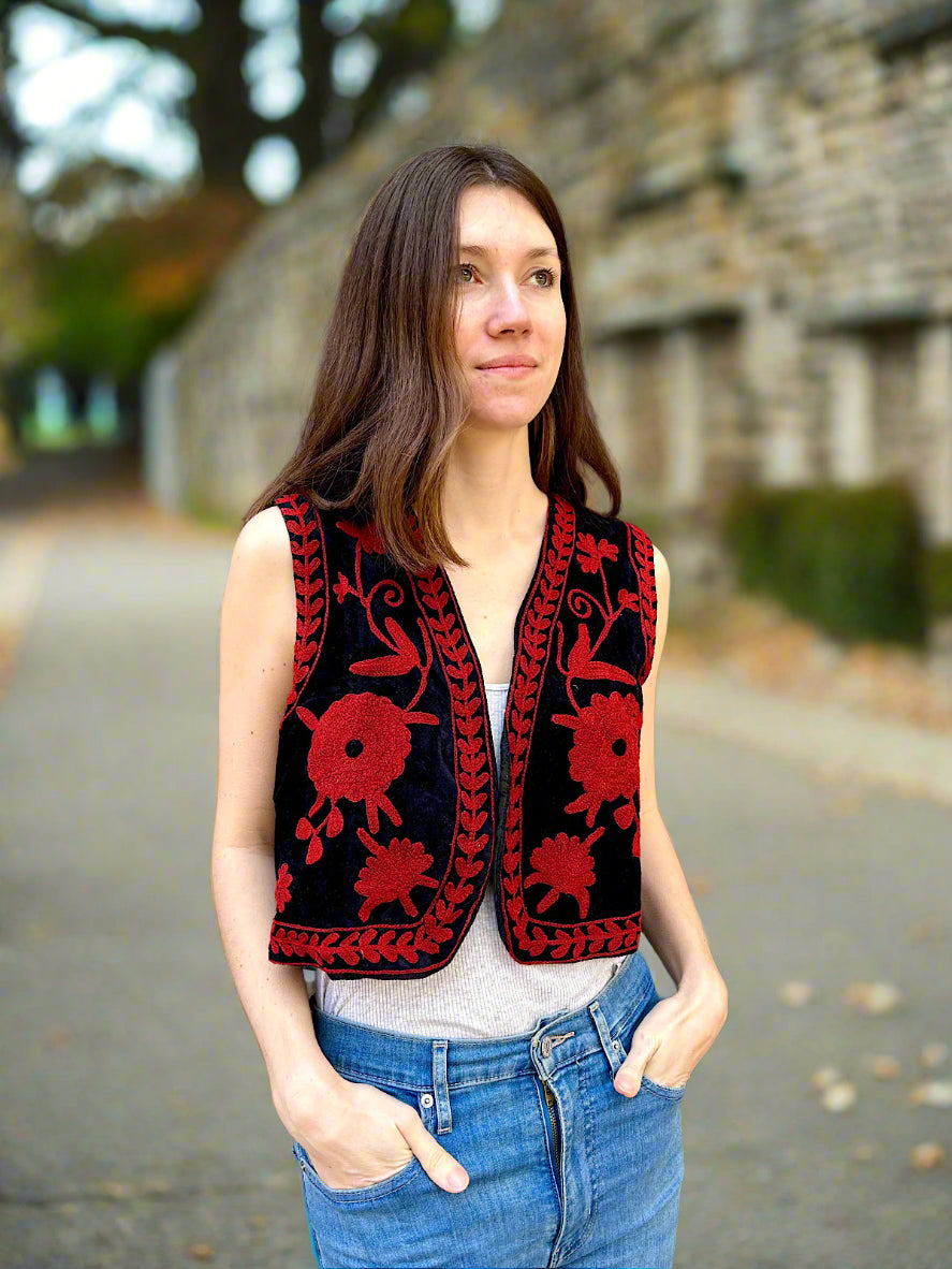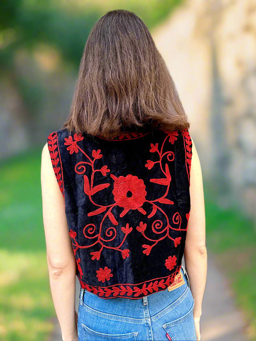 This lovely Velvet fabric is handcrafted by artisans in villages of developing countries. We love to support artisans and their beautiful crafts so they can continue making these special designs. This beautiful fabric is then designed and hand stitched into a Jacket that compliments its speciality and uniqueness.