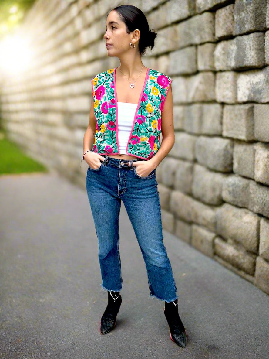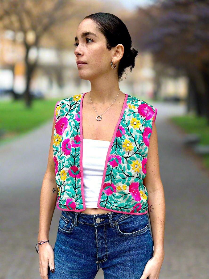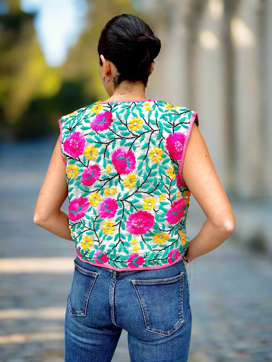 Pink and Yellow Flowers Bohemian Embroidered Vest