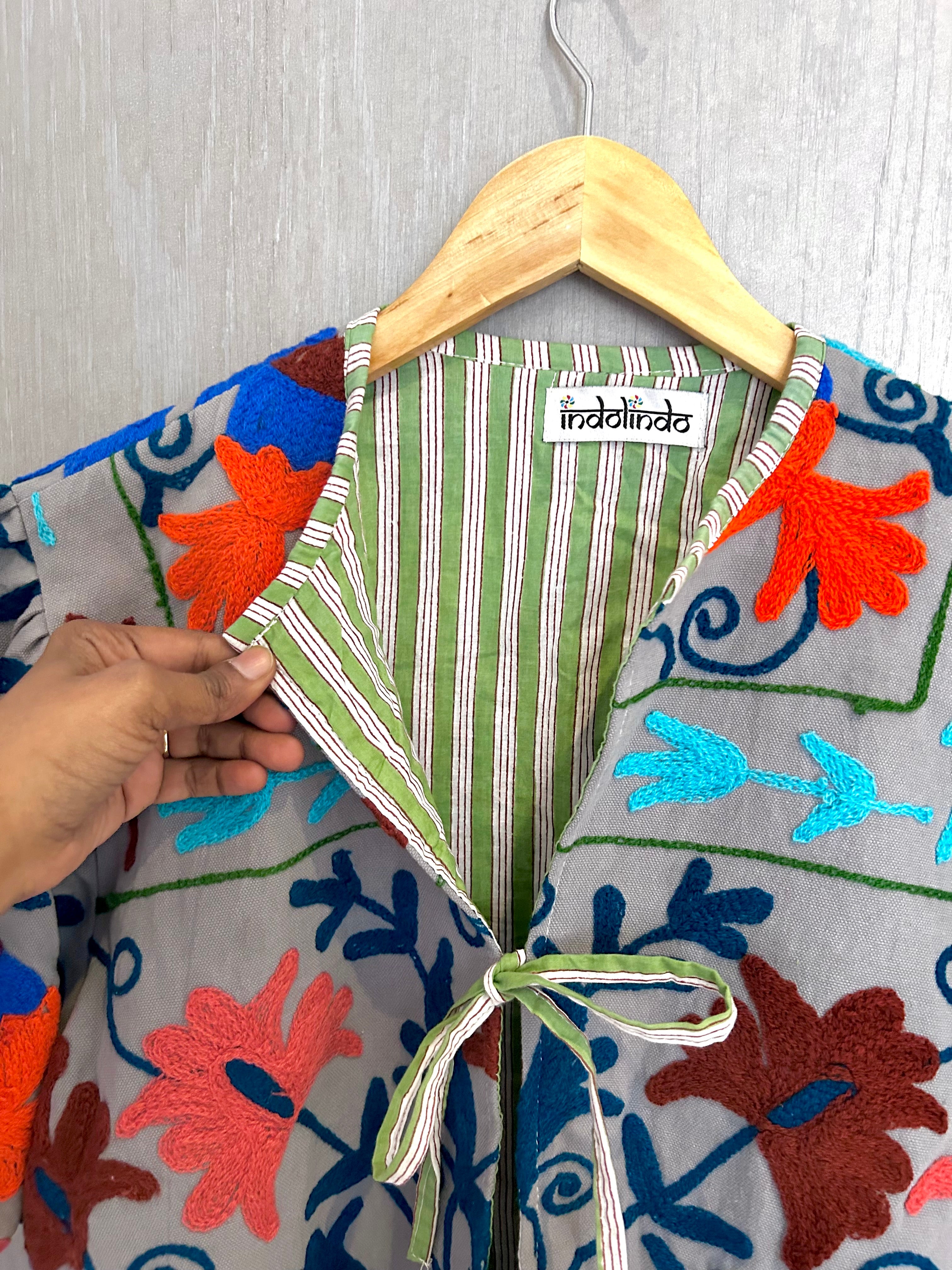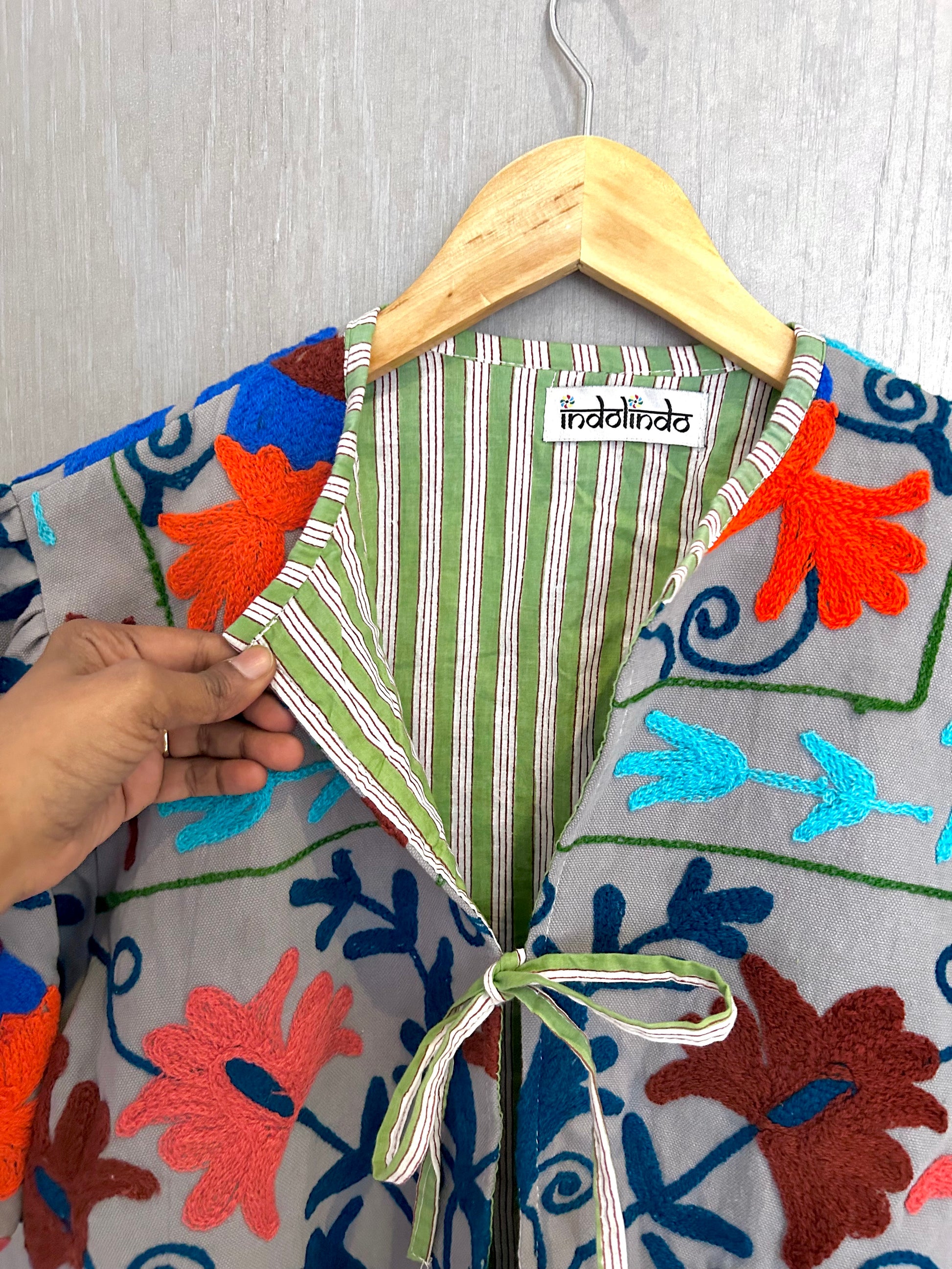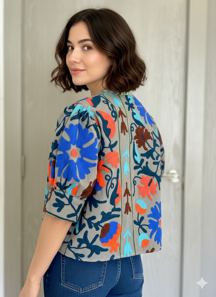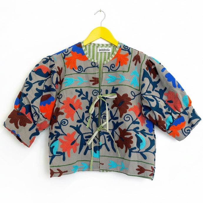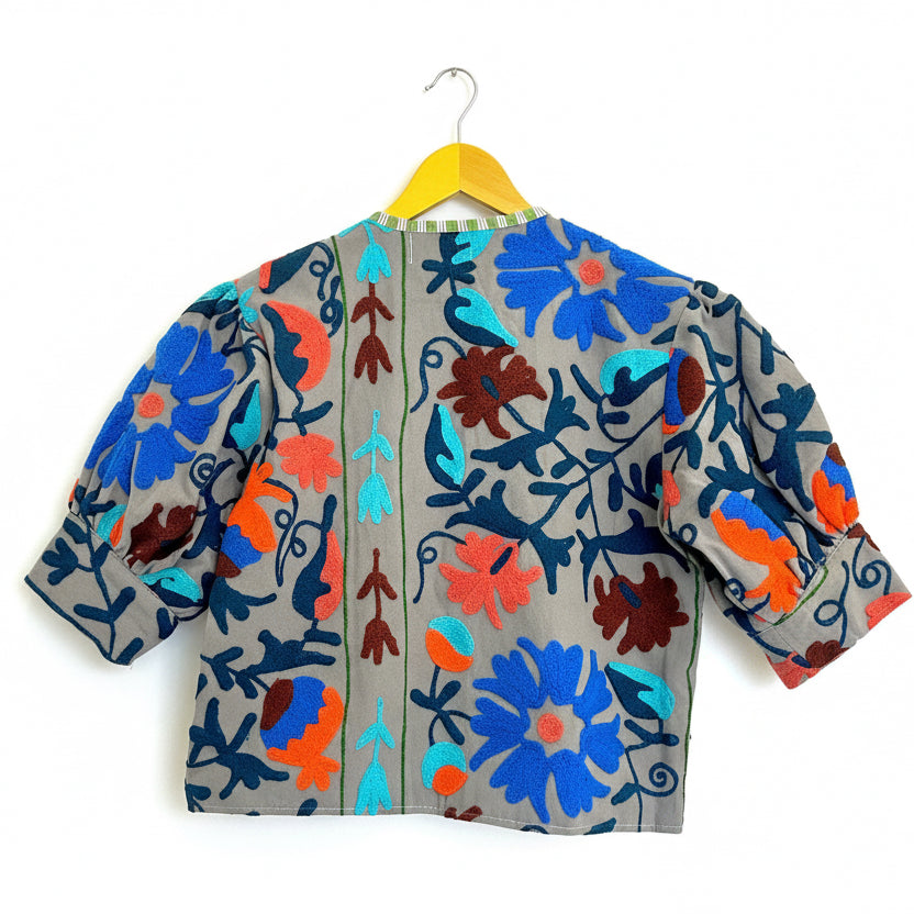 Grey Balloon Sleeve Cotton Embroidered Jacket