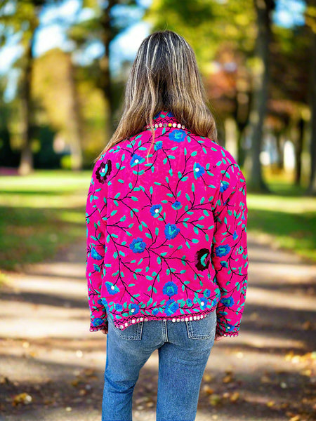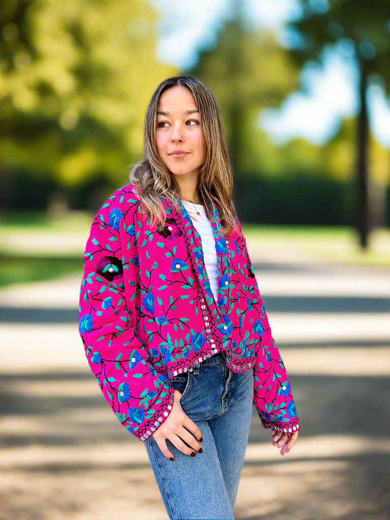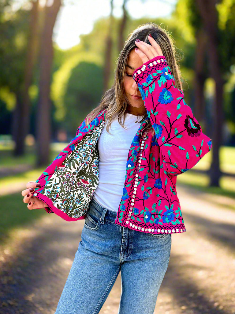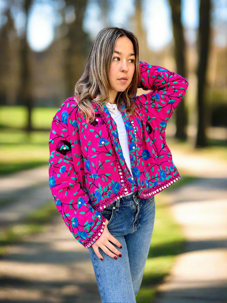 Magenta with Blue Flowers Crop Bohemian Embroidered Jacket