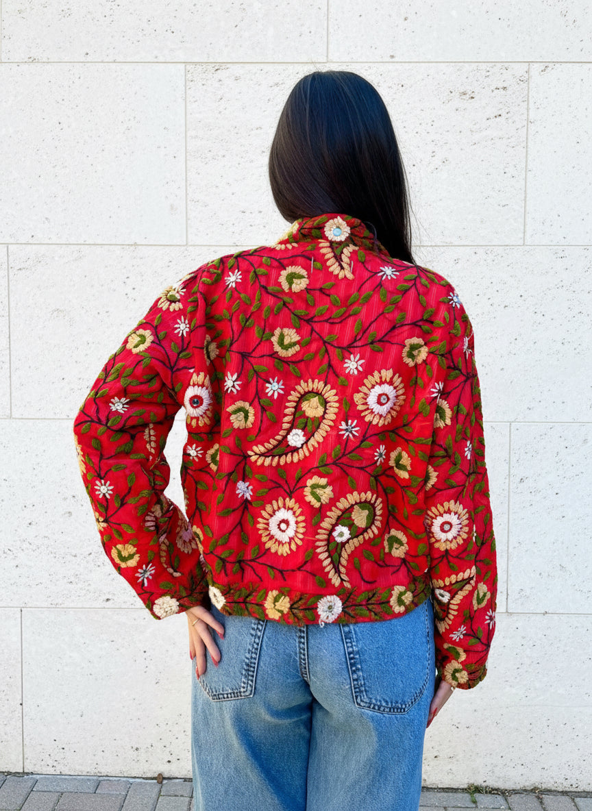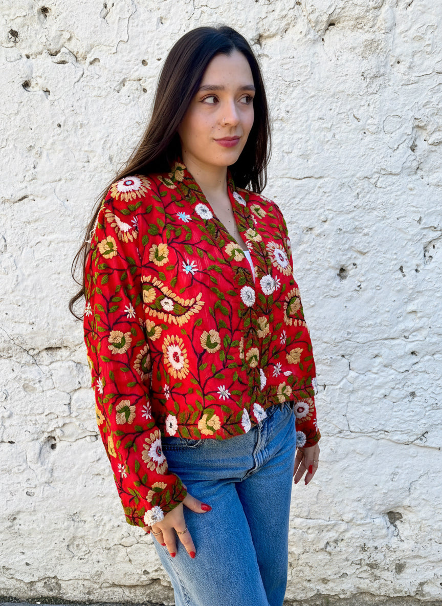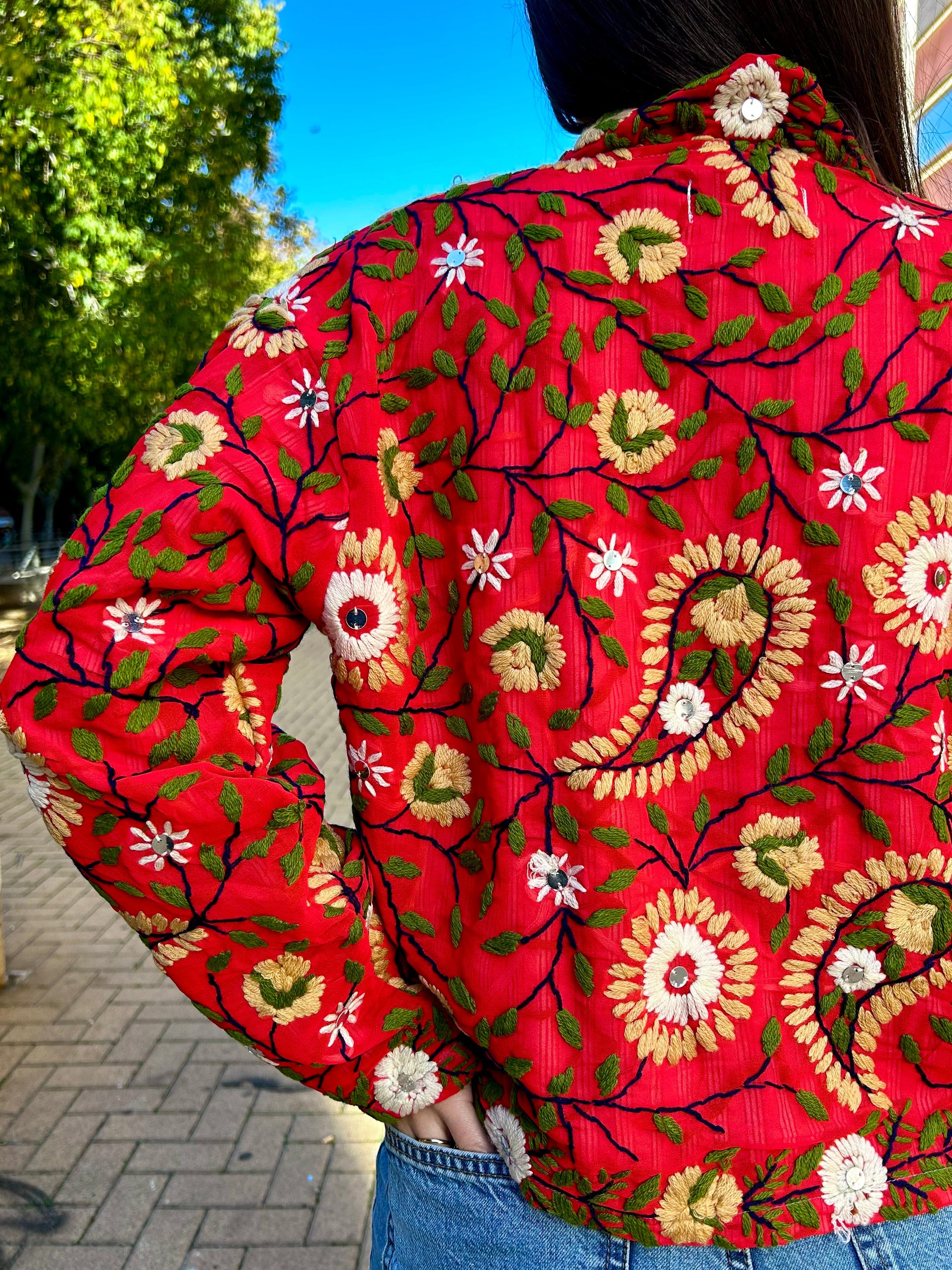Red with Yellow Flowers and Paisley Crop Bohemian Embroidered Jacket