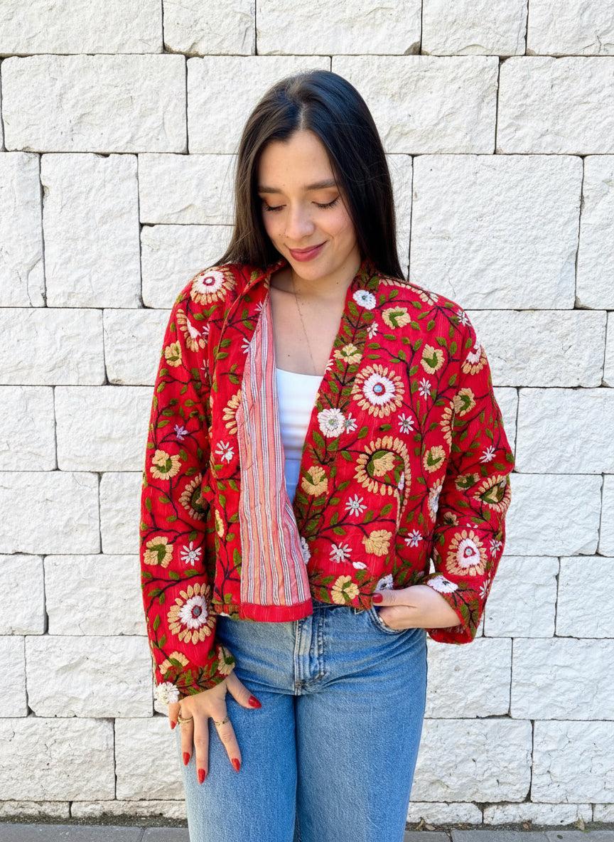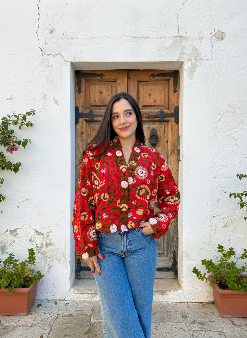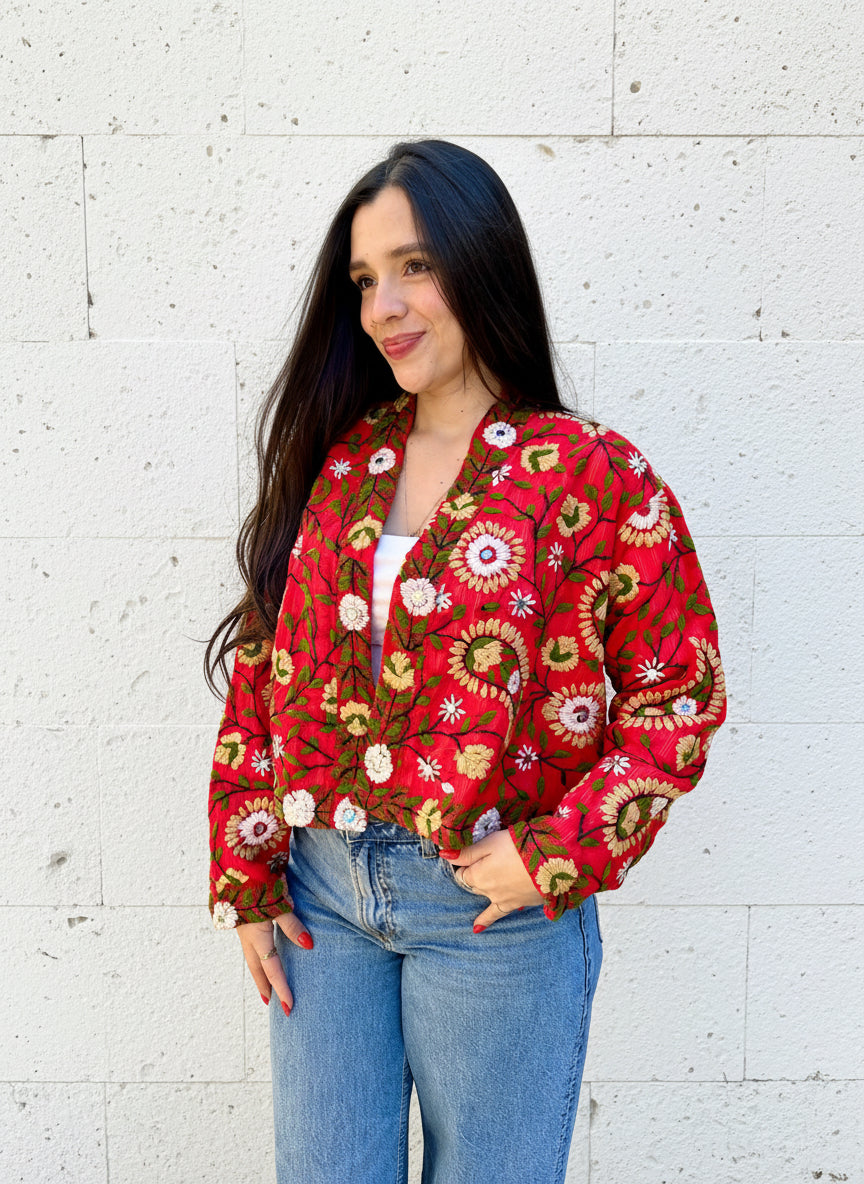 Red with Yellow Flowers and Paisley Crop Bohemian Embroidered Jacket