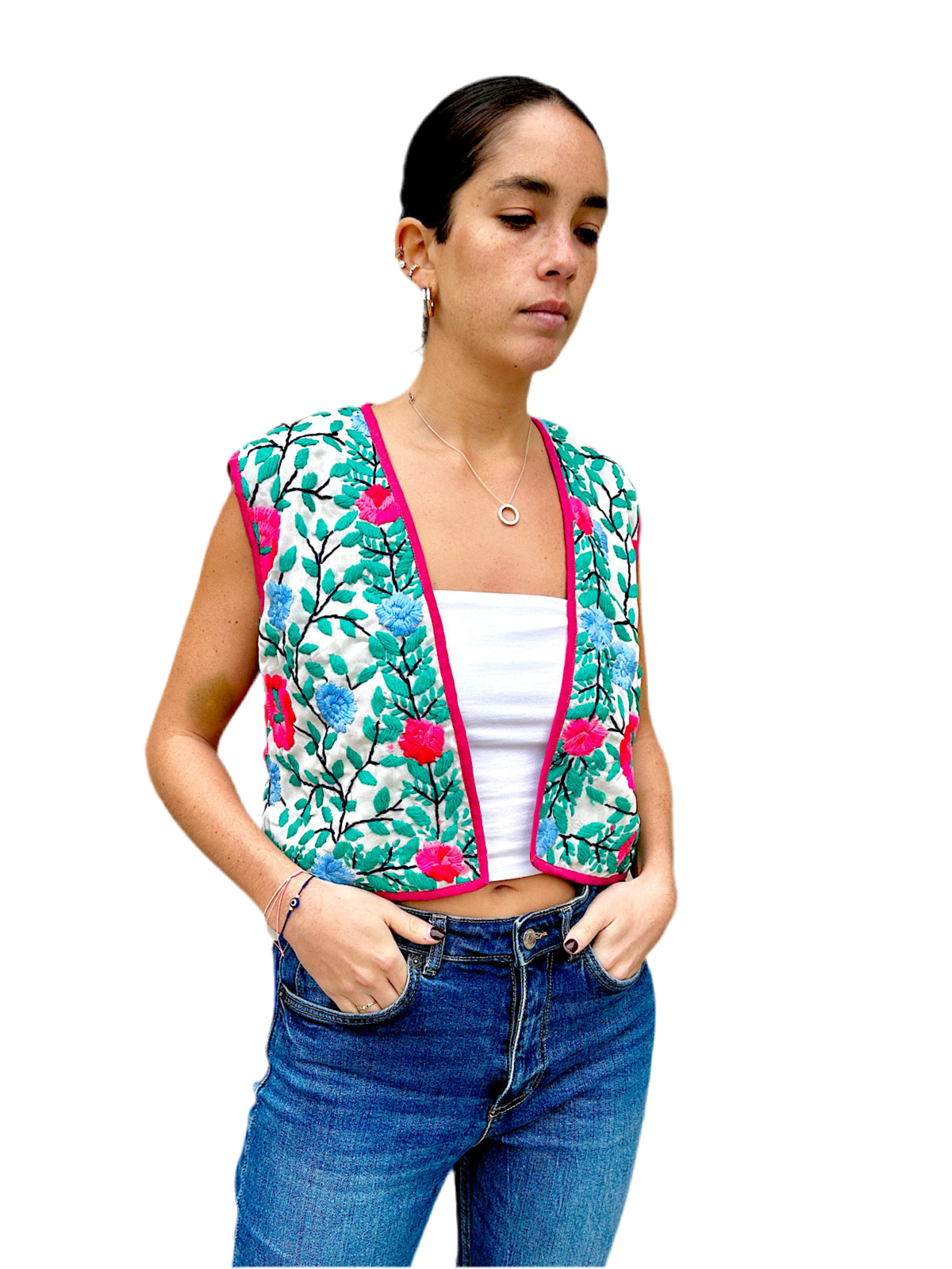 Pink and Blue Flowers Bohemian Embroidered Vest