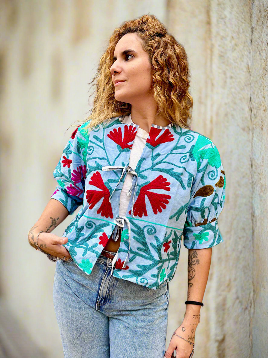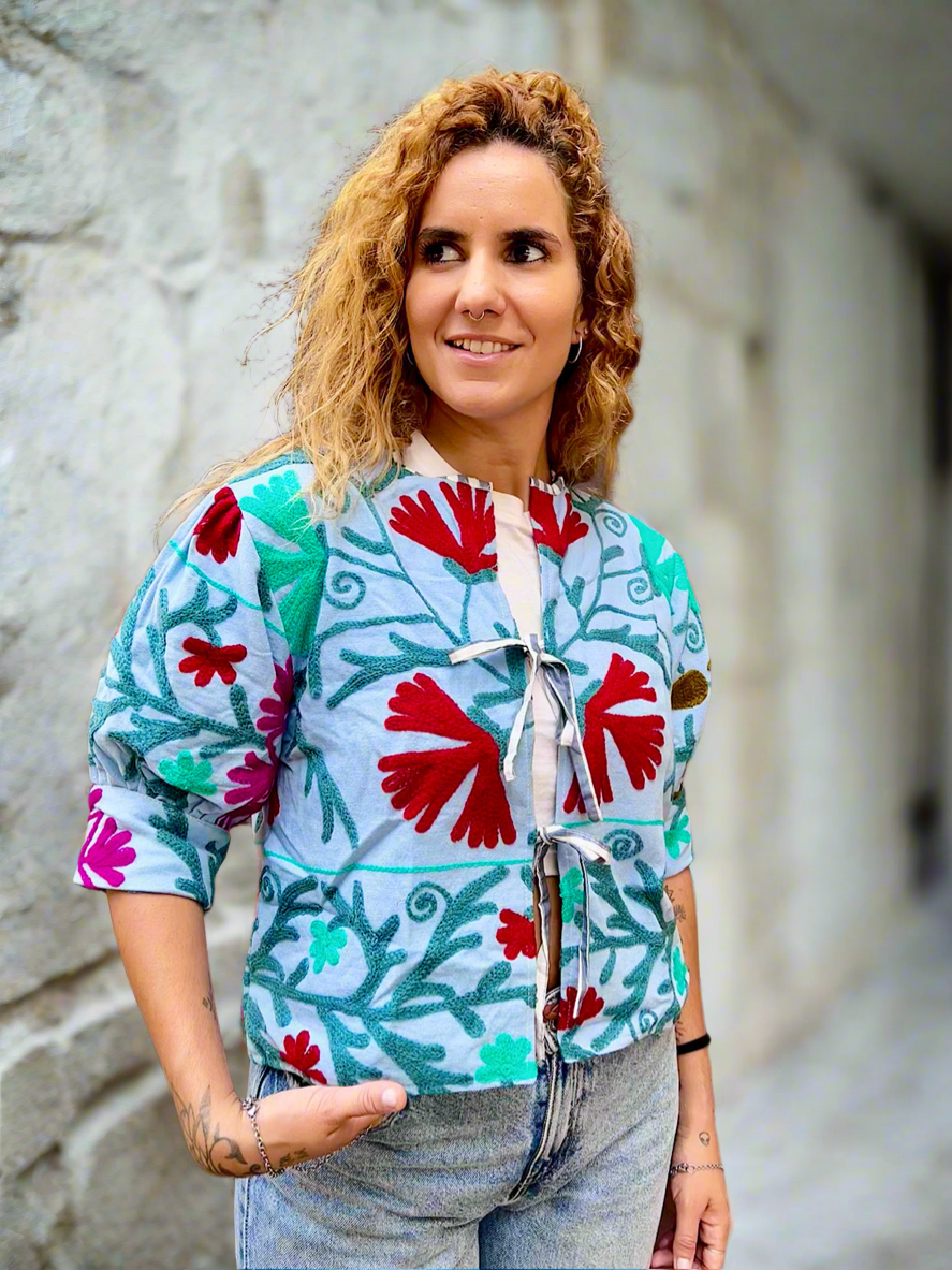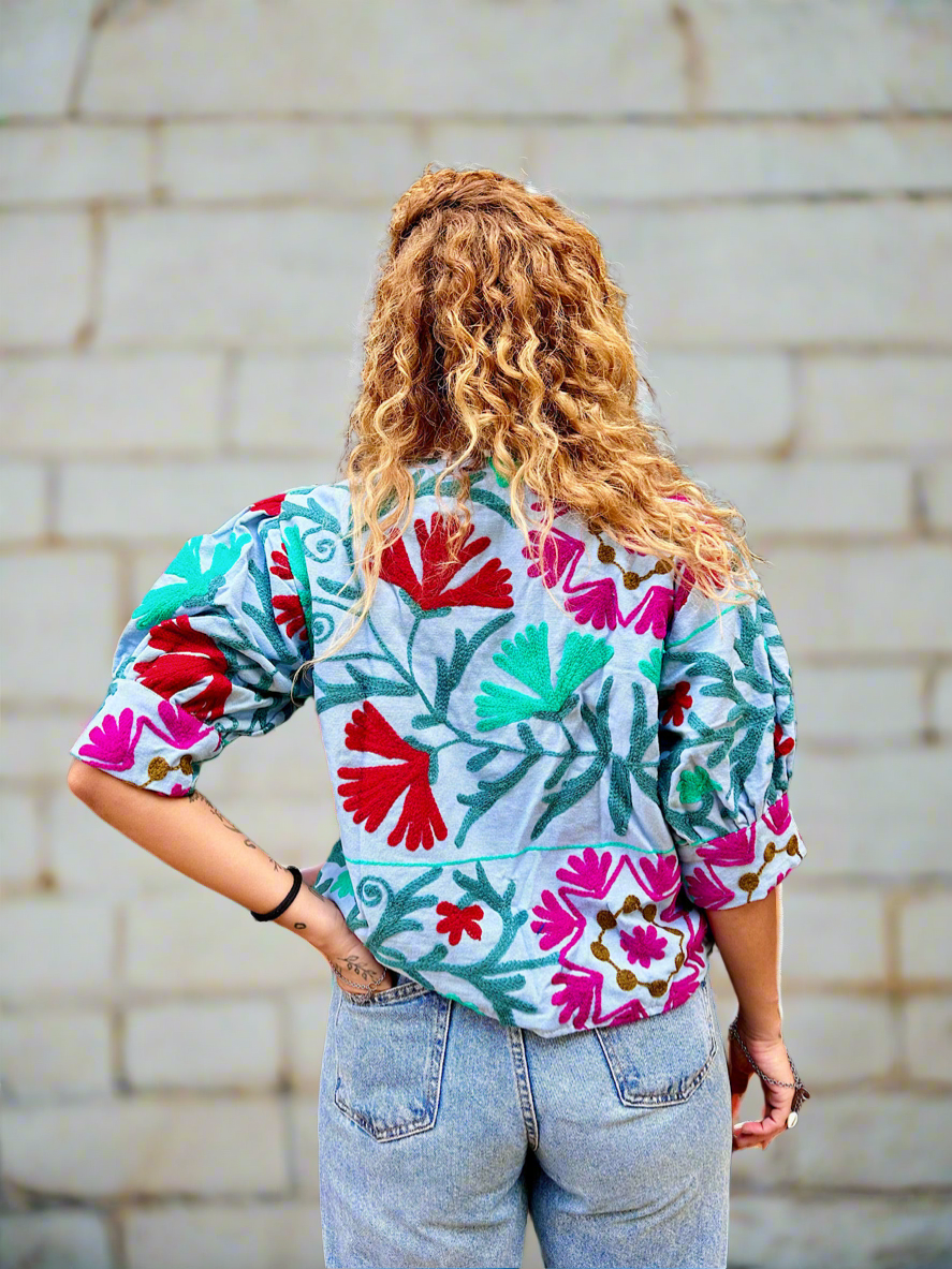 Blue Balloon Sleeve Cotton Embroidered Jacket