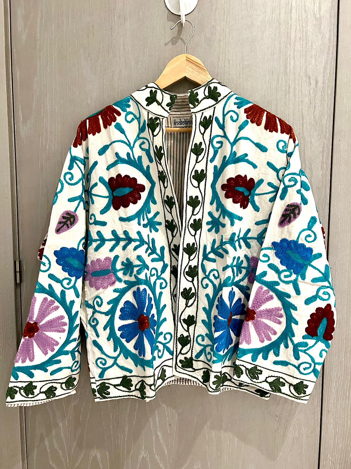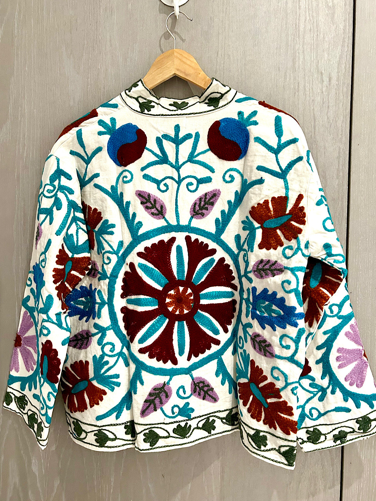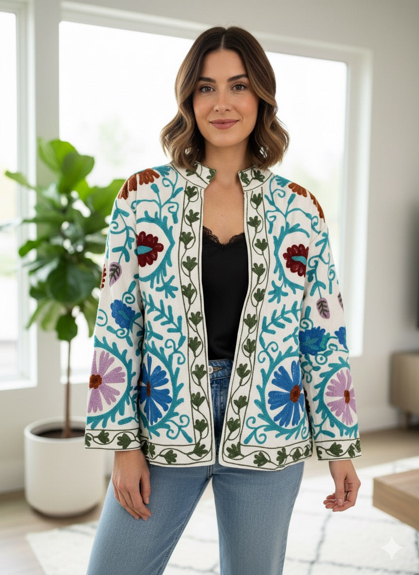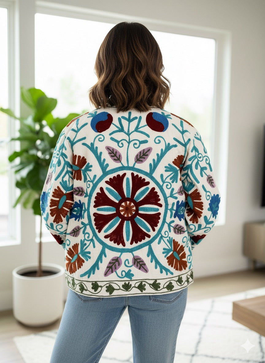 White with Maroon and Blue Suzani Cotton Embroidered Jacket
