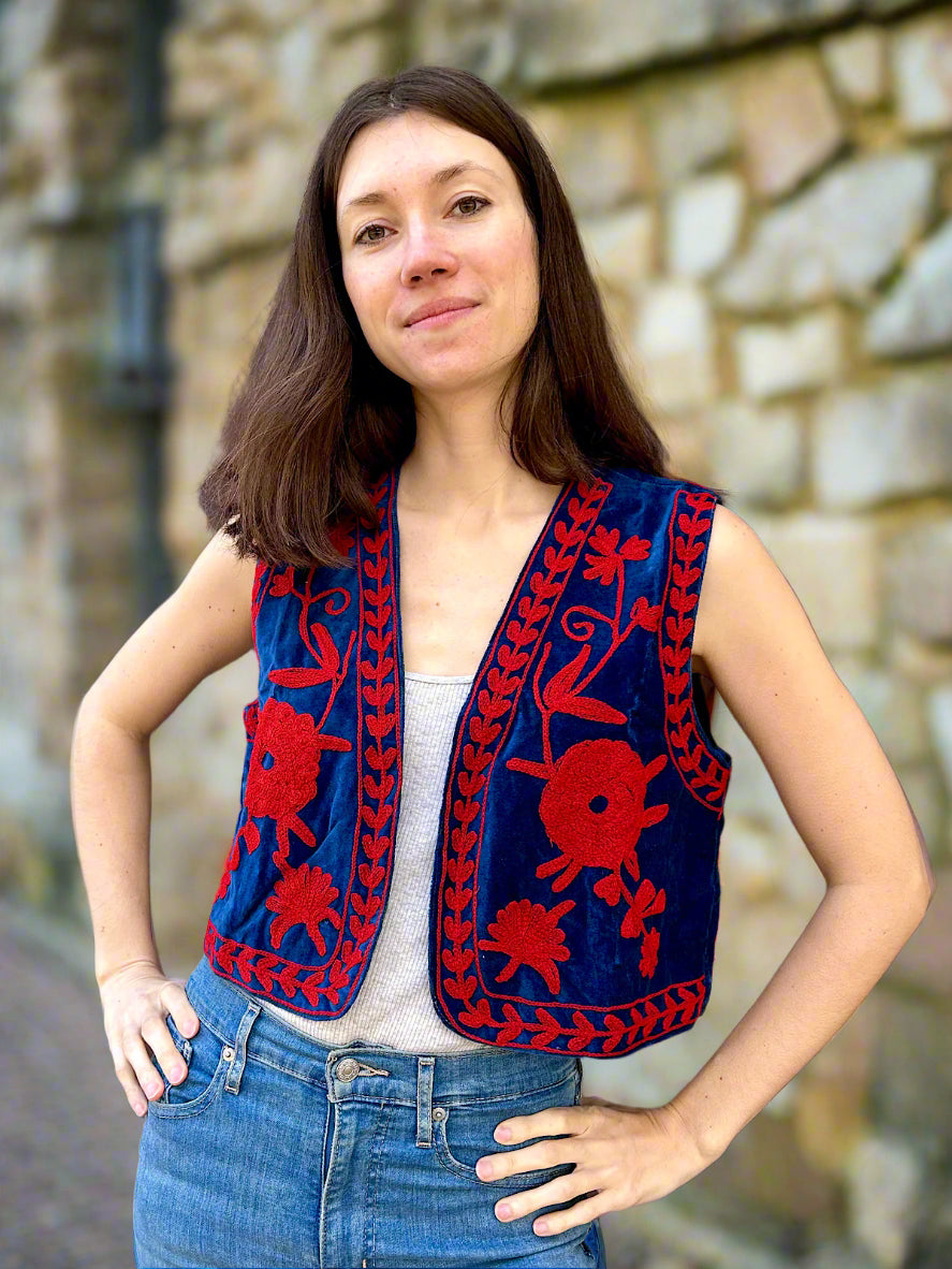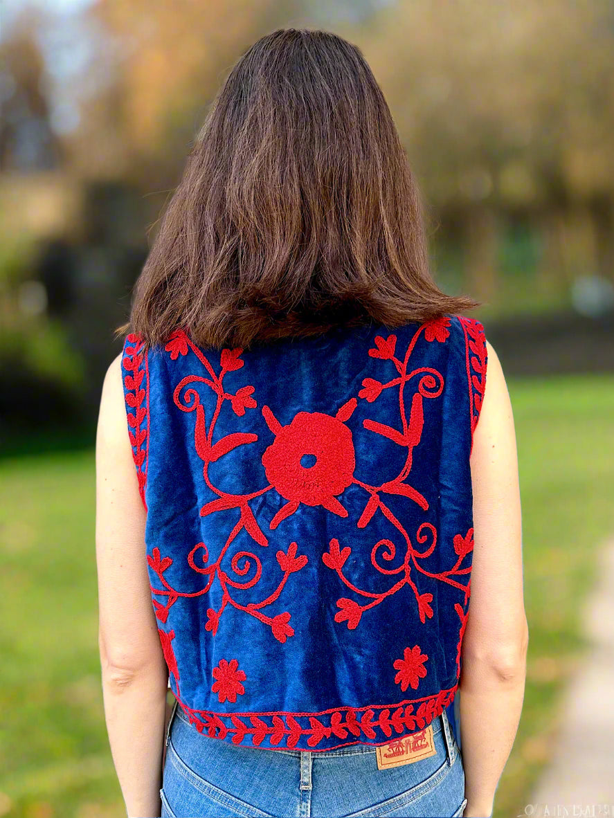 This lovely Velvet fabric is handcrafted by artisans in villages of developing countries. We love to support artisans and their beautiful crafts so they can continue making these special designs. This beautiful fabric is then designed and hand stitched into a Jacket that compliments its speciality and uniqueness.