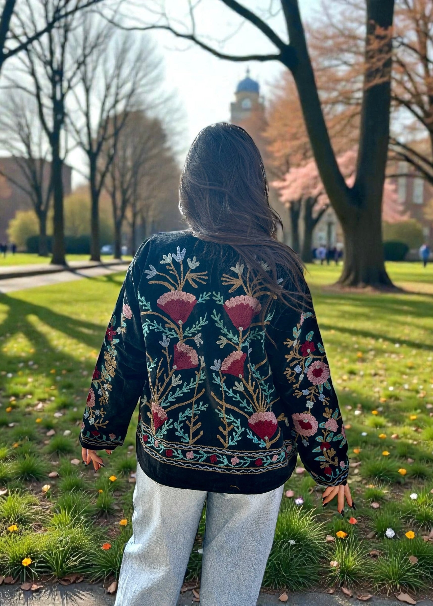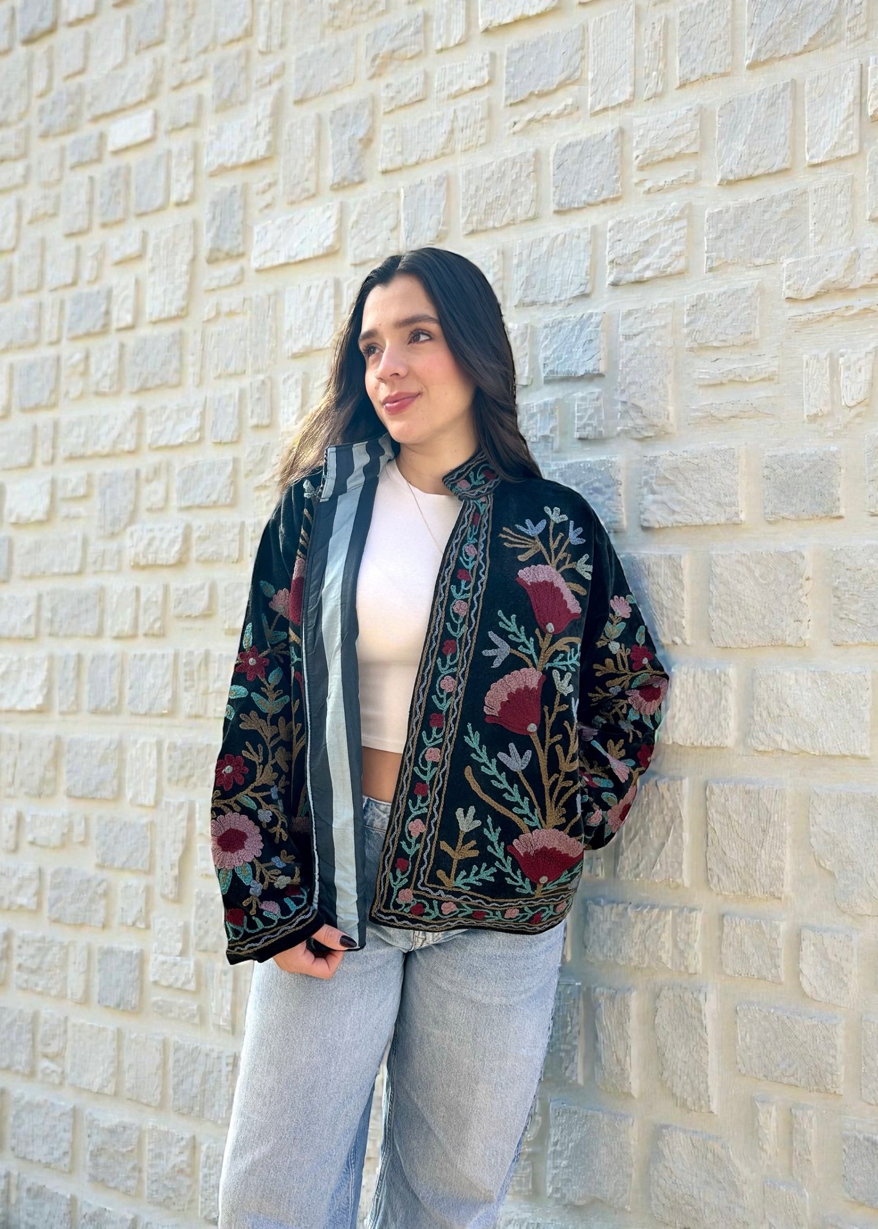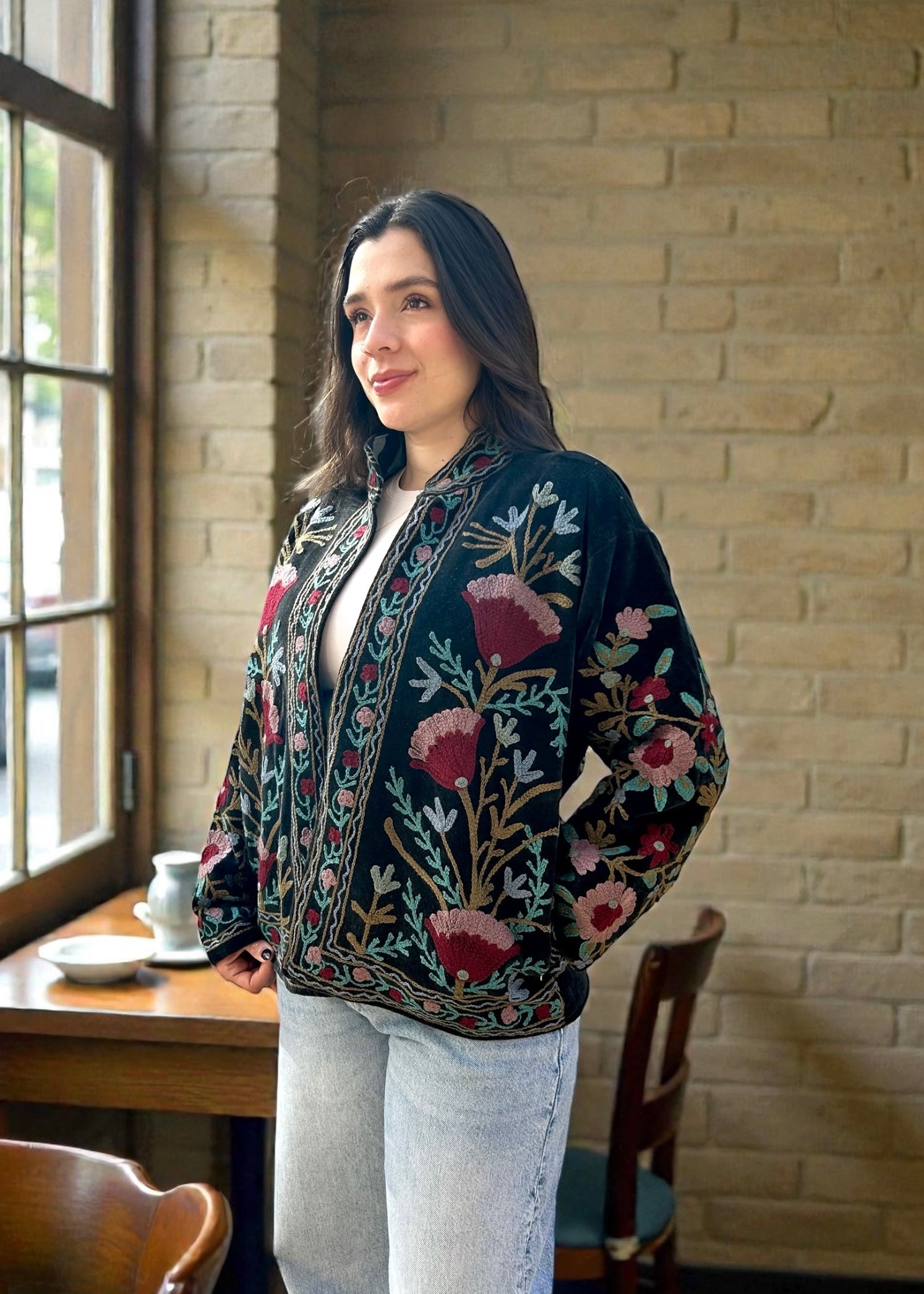 This lovely Velvet fabric is handcrafted by artisans in villages of developing countries. We love to support artisans and their beautiful crafts so they can continue making these special designs. This beautiful fabric is then designed and hand stitched into a Jacket that compliments its speciality and uniqueness.
