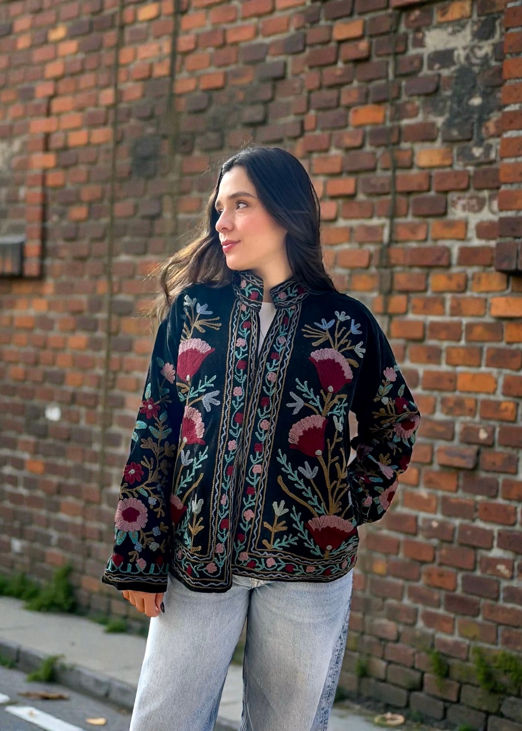 Black with Colourful Flowers Suzani Velvet Embroidered Jacket