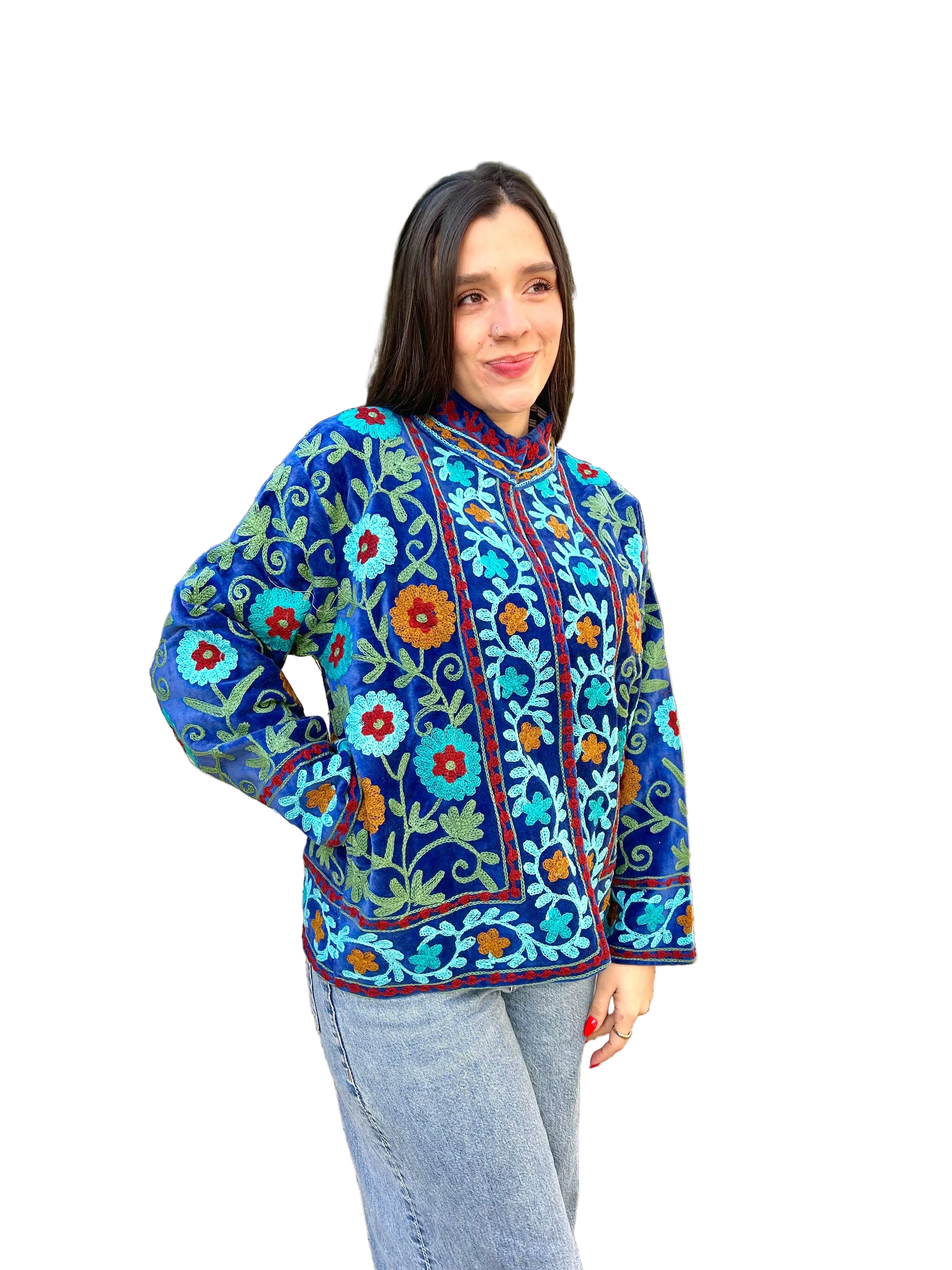 This special Handcrafted Velvet Jacket in this vibrant colour and embroidery is sure to make your day a lot more interesting.