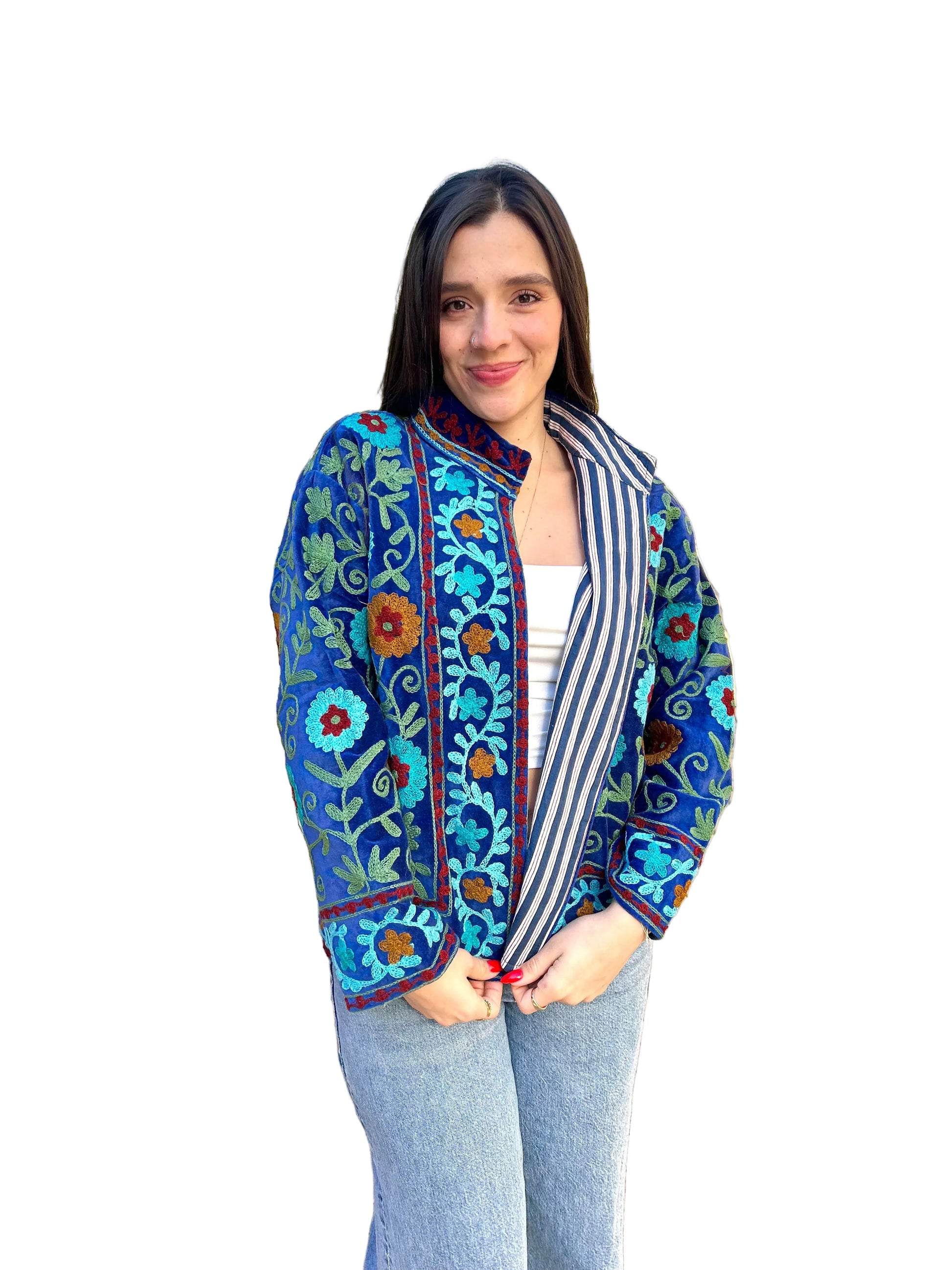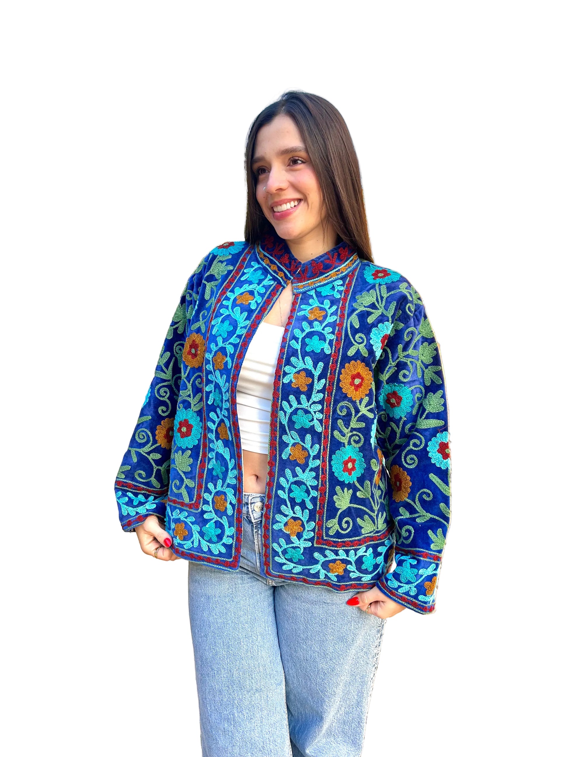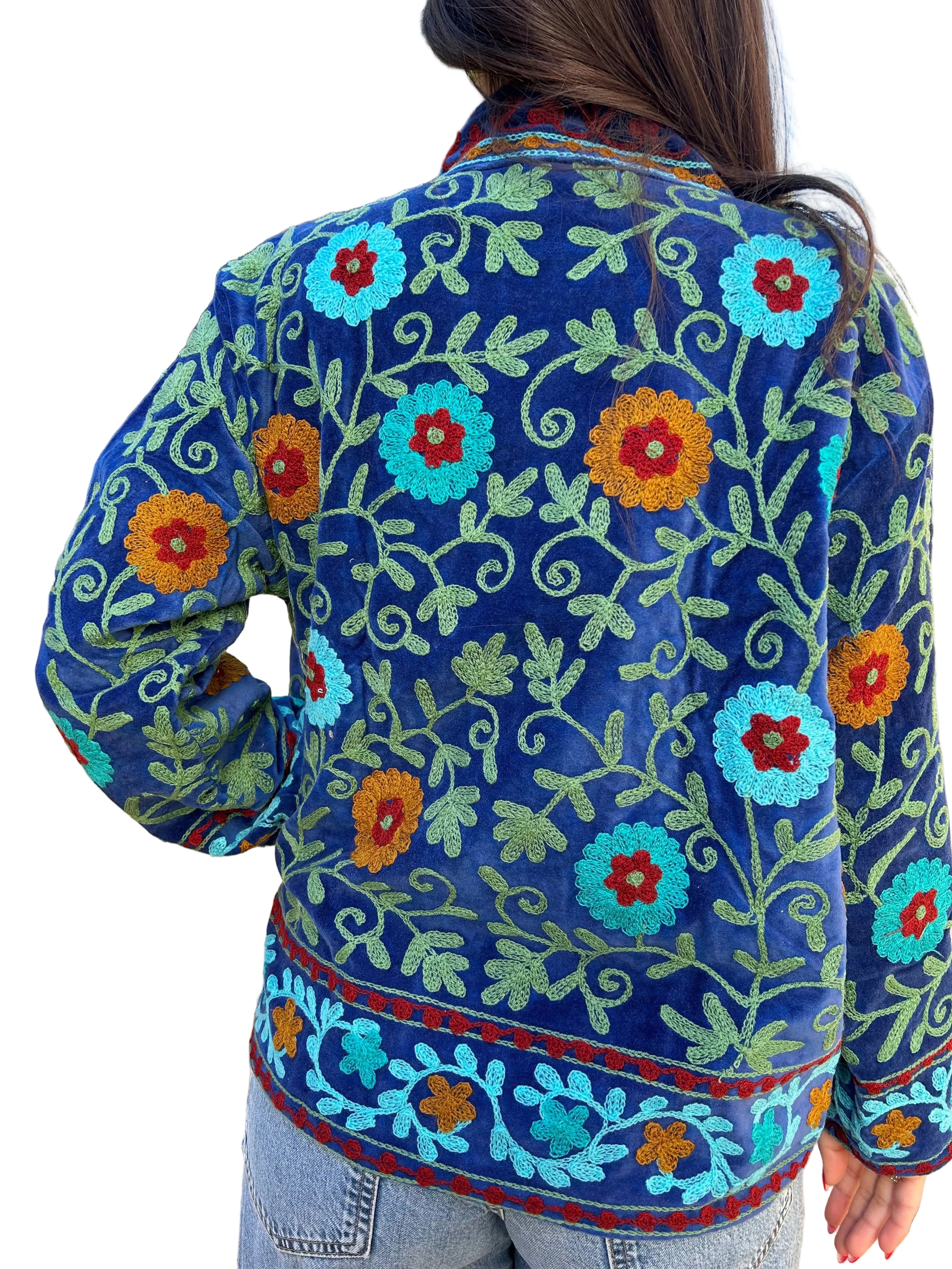 This lovely Velvet fabric is handcrafted by artisans in villages of developing countries. We love to support artisans and their beautiful crafts so they can continue making these special designs. This beautiful fabric is then designed and hand stitched into a Jacket that compliments its speciality and uniqueness.