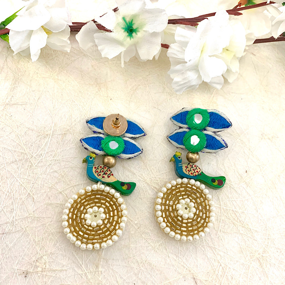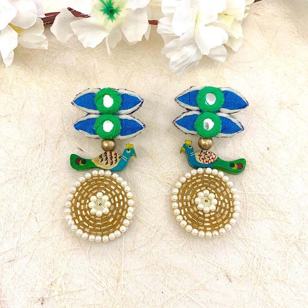 These earrings are handcrafted with unique hand embroidered patches, and some super cute hand painted birdie piecesIt is a wonderfully fun pair, glammed up with golden embroidery to spice up your outfit while adding a unique charm to your look.